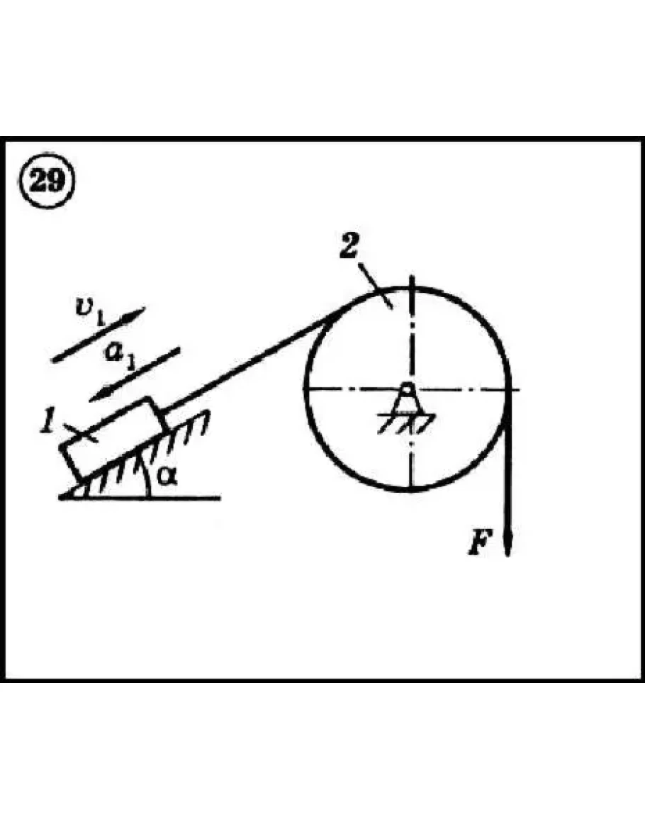 Для приведенной на схеме механической системы, используя принцип Даламбера, определить величину силы F, необходимую для перемещения груза с заданным ускорением a1, а также усилие в грузовом тросе. Исходные данные: массы груза m1 и барабана m2, радиус барабана R2 (у двойного барабана имеется также r2), его радиус инерции ρ2 (если он не задан, тело считать однородным цилиндром), угол α и коэффициент трения скольжения f приведены в таблице. Непронумерованные блоки и катки считать невесомыми. Трением на осях барабана и блоков пренебречь.