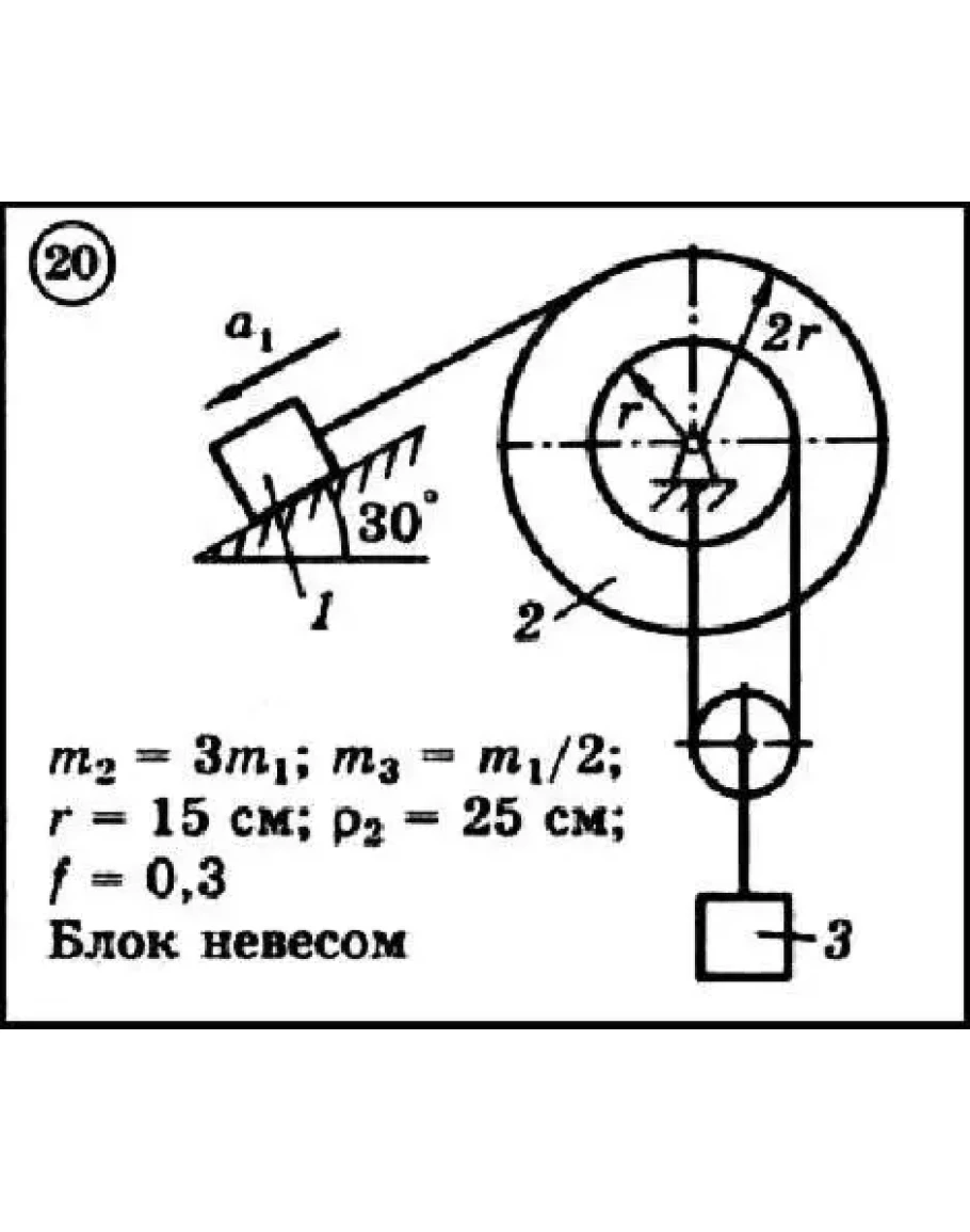 Для приведенной на схеме механической системы, используя уравнения Лагранжа второго рода, определить указанное на схеме угловое ускорение или линейное ускорение. Нити невесомы и нерастяжимы. Принятые обозначения: m - массы тел, R и r - радиусы, ρ - радиус инерции (если он не указан, тело считать однородным цилиндром); при наличии трения указываются: f - коэффициент трения скольжения, fk - коэффициент трения качения.