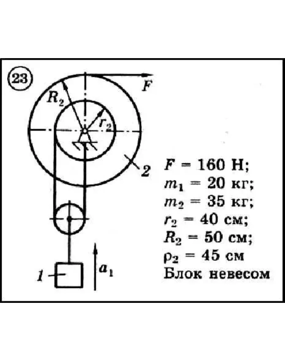 Для приведенной на схеме механической системы, используя уравнения Лагранжа второго рода, определить указанное на схеме угловое ускорение или линейное ускорение. Нити невесомы и нерастяжимы. Принятые обозначения: m - массы тел, R и r - радиусы, ρ - радиус инерции (если он не указан, тело считать однородным цилиндром); при наличии трения указываются: f - коэффициент трения скольжения, fk - коэффициент трения качения.