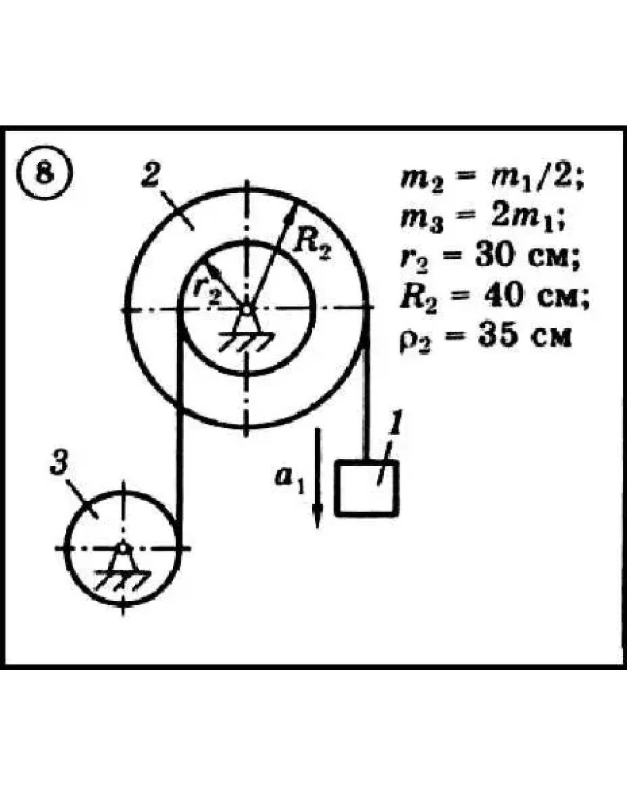 Для приведенной на схеме механической системы, используя уравнения Лагранжа второго рода, определить указанное на схеме угловое ускорение или линейное ускорение. Нити невесомы и нерастяжимы. Принятые обозначения: m - массы тел, R и r - радиусы, ρ - радиус инерции (если он не указан, тело считать однородным цилиндром); при наличии трения указываются: f - коэффициент трения скольжения, fk - коэффициент трения качения.