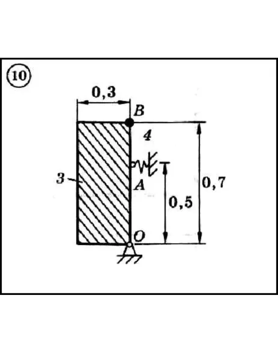 Для приведенной на схеме механической системы определить собственную частоту колебаний. Механическая система, показанная на схеме в положении равновесия, может совершать свободные колебания, вращаясь вокруг горизонтальной оси z, проходящей через неподвижную точку O. Система состоит из жестко скрепленных друг с другом тел: тонких однородных стержней 1 и 2 или однородной пластины 3 и точечного груза 4. Масса 1 м длины стержней равна 25 кг, масса 1 м2 площади пластины - 50 кг, масса точечного груза - 20 кг. Упругие элементы имеют коэффициент жесткости c = 10кН/м. Размеры частей системы указаны в метрах.