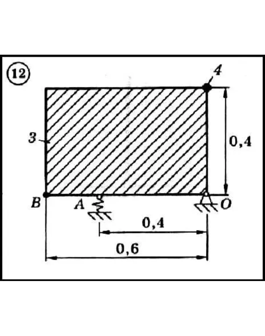Для приведенной на схеме механической системы определить собственную частоту колебаний. Механическая система, показанная на схеме в положении равновесия, может совершать свободные колебания, вращаясь вокруг горизонтальной оси z, проходящей через неподвижную точку O. Система состоит из жестко скрепленных друг с другом тел: тонких однородных стержней 1 и 2 или однородной пластины 3 и точечного груза 4. Масса 1 м длины стержней равна 25 кг, масса 1 м2 площади пластины - 50 кг, масса точечного груза - 20 кг. Упругие элементы имеют коэффициент жесткости c = 10кН/м. Размеры частей системы указаны в метрах.