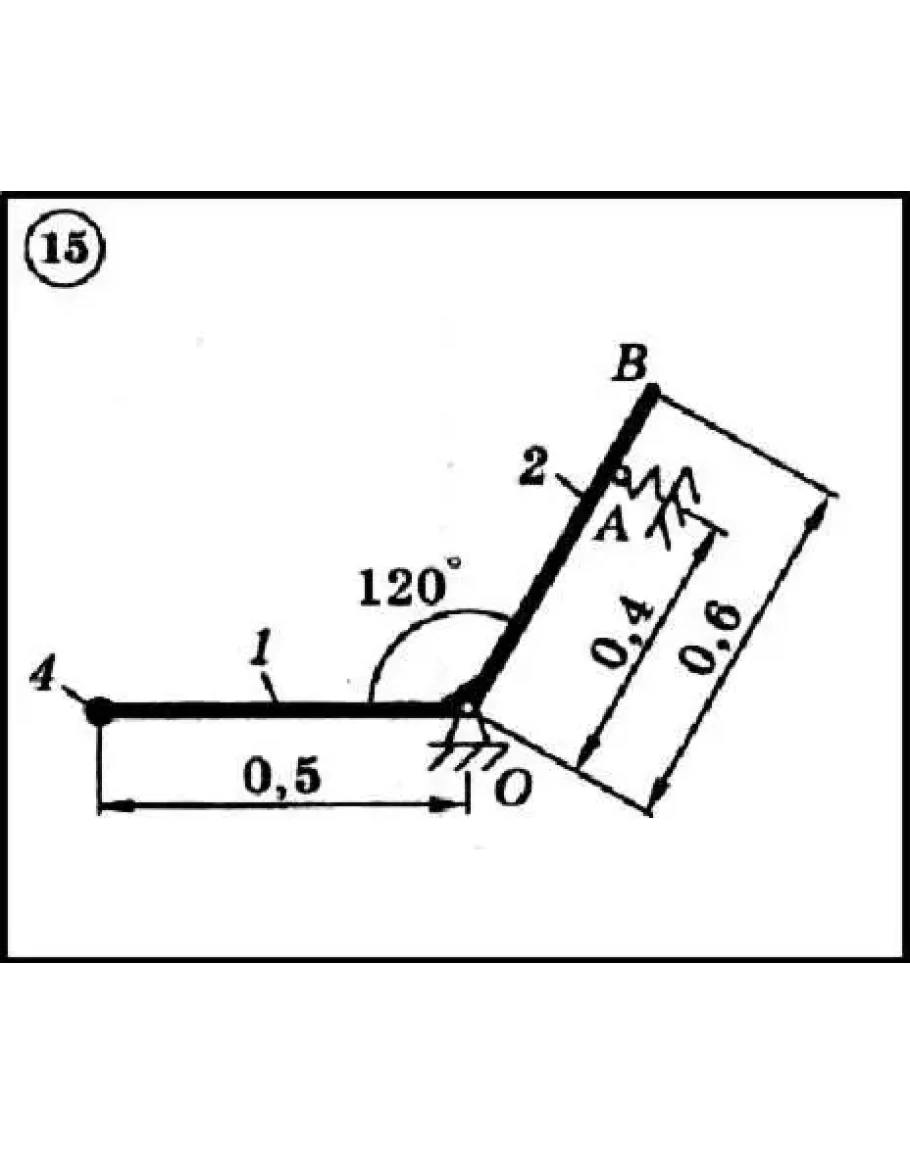 Для приведенной на схеме механической системы определить собственную частоту колебаний. Механическая система, показанная на схеме в положении равновесия, может совершать свободные колебания, вращаясь вокруг горизонтальной оси z, проходящей через неподвижную точку O. Система состоит из жестко скрепленных друг с другом тел: тонких однородных стержней 1 и 2 или однородной пластины 3 и точечного груза 4. Масса 1 м длины стержней равна 25 кг, масса 1 м2 площади пластины - 50 кг, масса точечного груза - 20 кг. Упругие элементы имеют коэффициент жесткости c = 10кН/м. Размеры частей системы указаны в метрах.