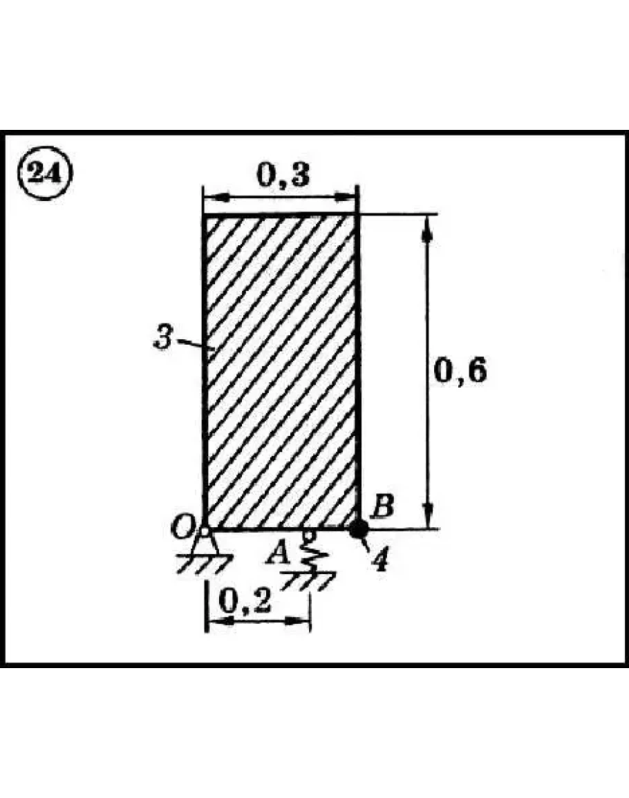 Для приведенной на схеме механической системы определить собственную частоту колебаний. Механическая система, показанная на схеме в положении равновесия, может совершать свободные колебания, вращаясь вокруг горизонтальной оси z, проходящей через неподвижную точку O. Система состоит из жестко скрепленных друг с другом тел: тонких однородных стержней 1 и 2 или однородной пластины 3 и точечного груза 4. Масса 1 м длины стержней равна 25 кг, масса 1 м2 площади пластины - 50 кг, масса точечного груза - 20 кг. Упругие элементы имеют коэффициент жесткости c = 10кН/м. Размеры частей системы указаны в метрах.
