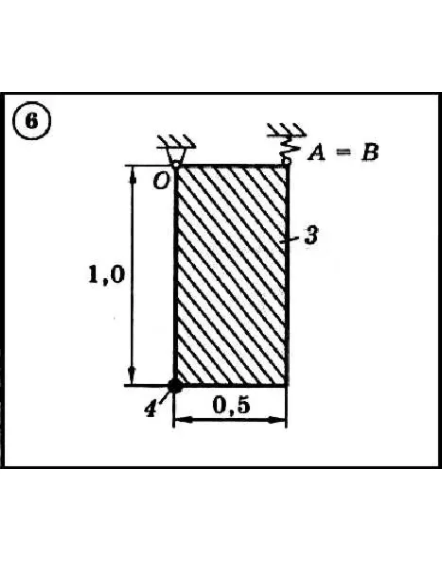 Для приведенной на схеме механической системы определить собственную частоту колебаний. Механическая система, показанная на схеме в положении равновесия, может совершать свободные колебания, вращаясь вокруг горизонтальной оси z, проходящей через неподвижную точку O. Система состоит из жестко скрепленных друг с другом тел: тонких однородных стержней 1 и 2 или однородной пластины 3 и точечного груза 4. Масса 1 м длины стержней равна 25 кг, масса 1 м2 площади пластины - 50 кг, масса точечного груза - 20 кг. Упругие элементы имеют коэффициент жесткости c = 10кН/м. Размеры частей системы указаны в метрах.