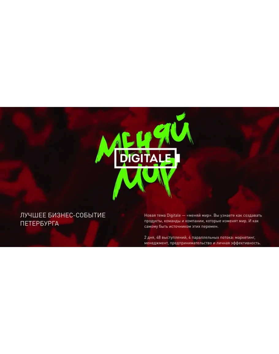 Новая тема Digitale — «меняй мир». Вы узнаете как создавать продукты, команды и компании, которые изменят мир. И как самому быть источником этих перемен. 2 дня, 48 выступлений, 4 параллельных потока: маркетинг, менеджмент, предпринимательство и личная эффективность.