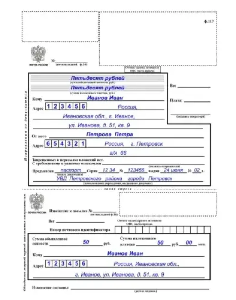 Бланк почты России ф.117 (cопроводительный адрес к посылке с наложенным платежом)