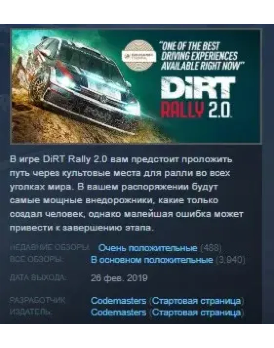 DiRT Rally 2.0 STEAM KEY RU+CIS СТИМ КЛЮЧ ЛИЦЕНЗИЯ
