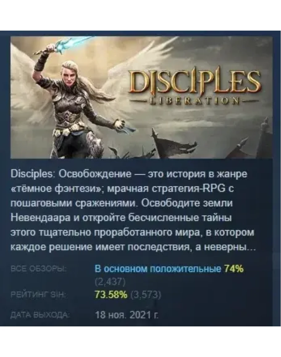 Disciples: Освобождение — это история в жанре «тёмное фэнтези»; мрачная стратегия-RPG с пошаговыми сражениями. Освободите земли Невендаара и откройте бесчисленные тайны этого тщательно проработанного мира, в котором каждое решение имеет последствия, а неверный шаг может обернуться трагедией.