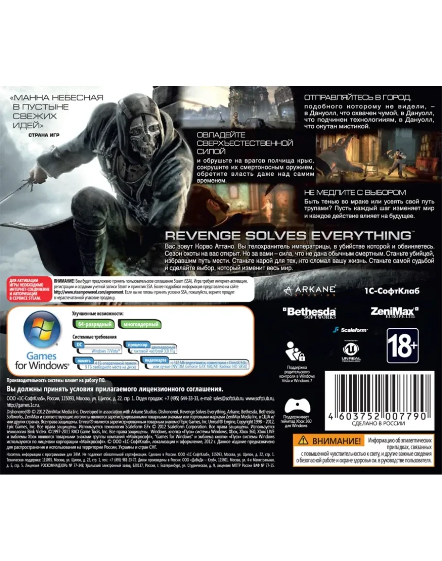 Dishonored — увлекательный и необычный экшен, в котором вам предстоит перевоплотиться в наемного убийцу, владеющего потусторонними силами. В вашем распоряжении — гибкая боевая система, необыкновенные способности и обширный арсенал всевозможных устройств. В мире Dishonored все зависит от ваших действий, а последующие миссии определяются выбором, сделанным в ходе игры.