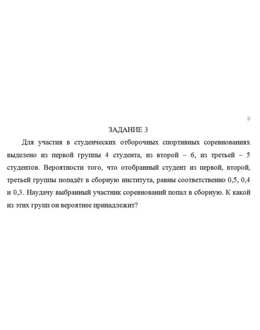 Для участия в студенческих отборочных спортивных соревнованиях выделено из первой группы 4 студента, из второй – 6, из третьей – 5 студентов. Вероятности того, что отобранный студент из первой, второй, третьей группы попадёт в сборную института, равны соответственно 0,5, 0,4 и 0,3. Наудачу выбранный участник соревнований попал в сборную. К какой из этих групп он вероятнее принадлежит?