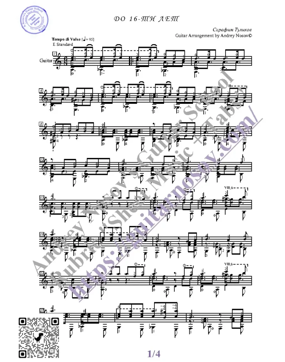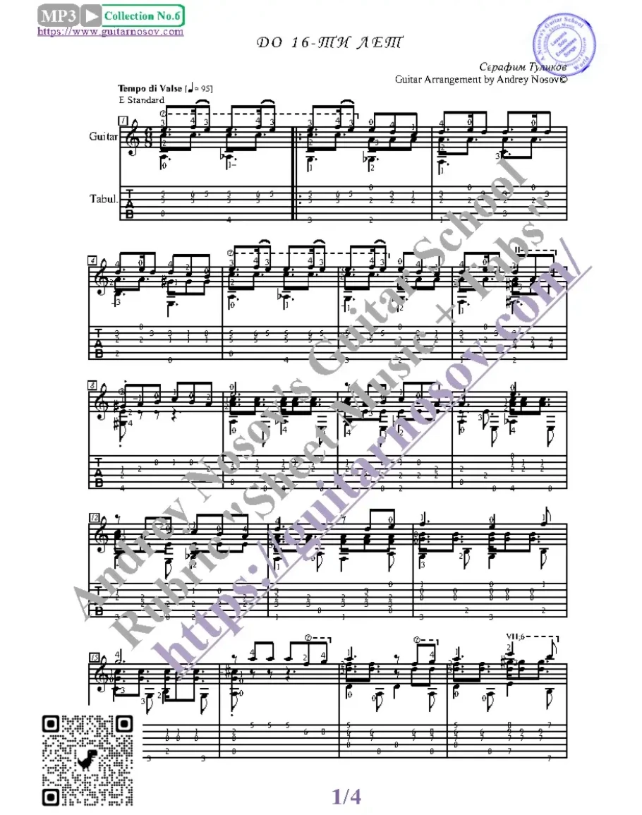 Кликните "Подробнее" для получения дополнительной информацииВашему вниманию предлагается композиция "До 16 лет (С.Туликов)", предназначенная для исполнения на 6-ти струнной гитаре СОЛО. Запись выполнена нотами, сопровождена подробнейшей аппликатурой и продублирована табулатурой.