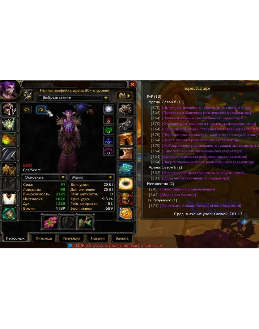 Друид ночная эльфийка (Ж) ПВП хил: 6007гс. Плечи, идол и 1 аксессуар а6, кольцо пве репа цлк. остальное а8 за арену. проф нет, маунт 1 саблезуб.