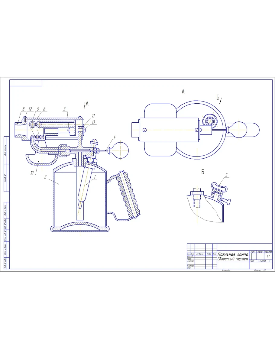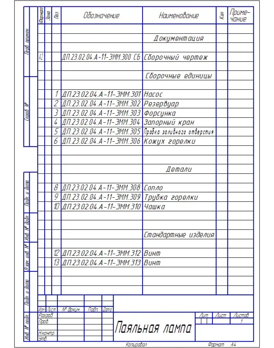 Чертеж сборочный паяльной лампы + спецификация