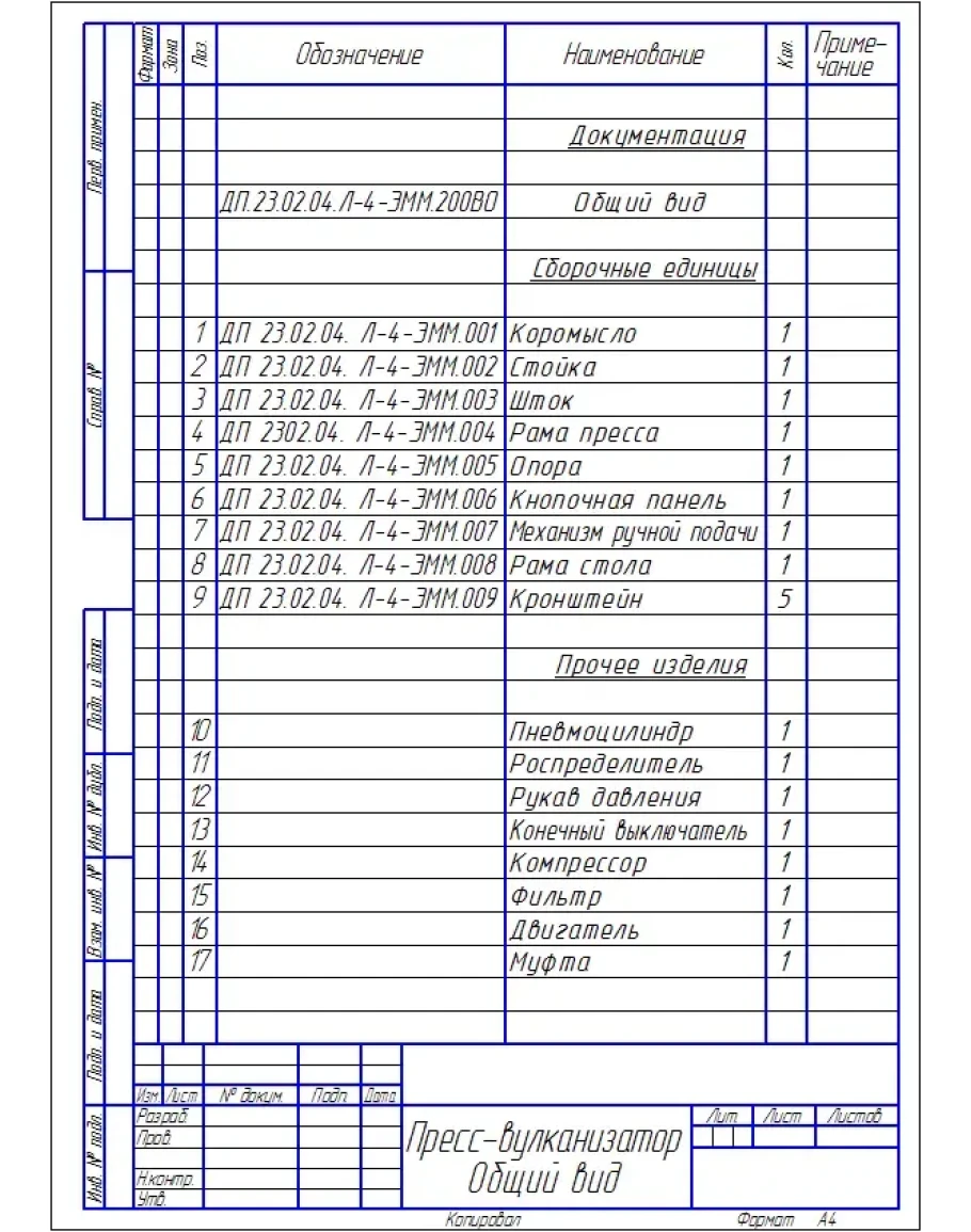 Сборочный чертеж Пресс-вулканизатора формат А1+спецификация