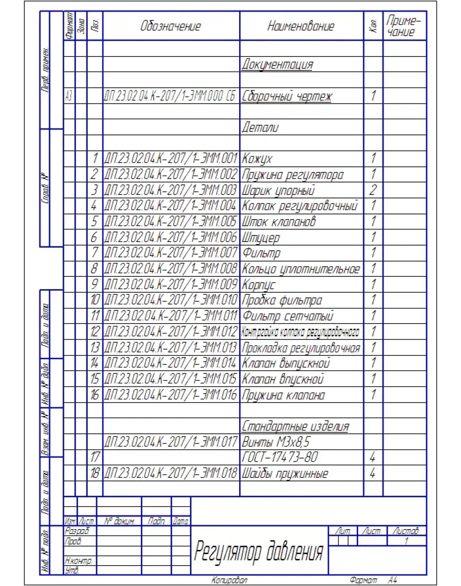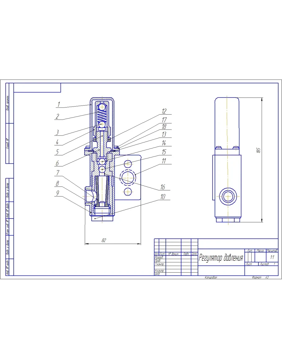 Регулятор давления. Сборочный чертеж+спецификация деталей.