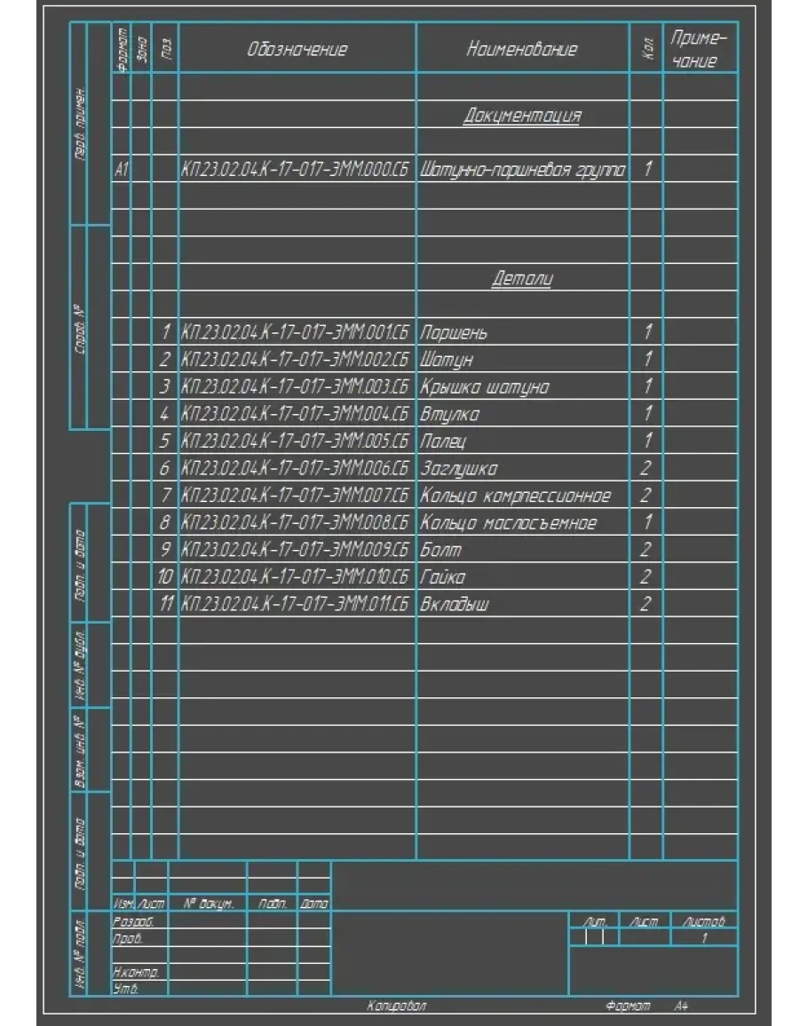 Чертеж Шатунно-поршневая группа автомобиля Формат А1+спецификация