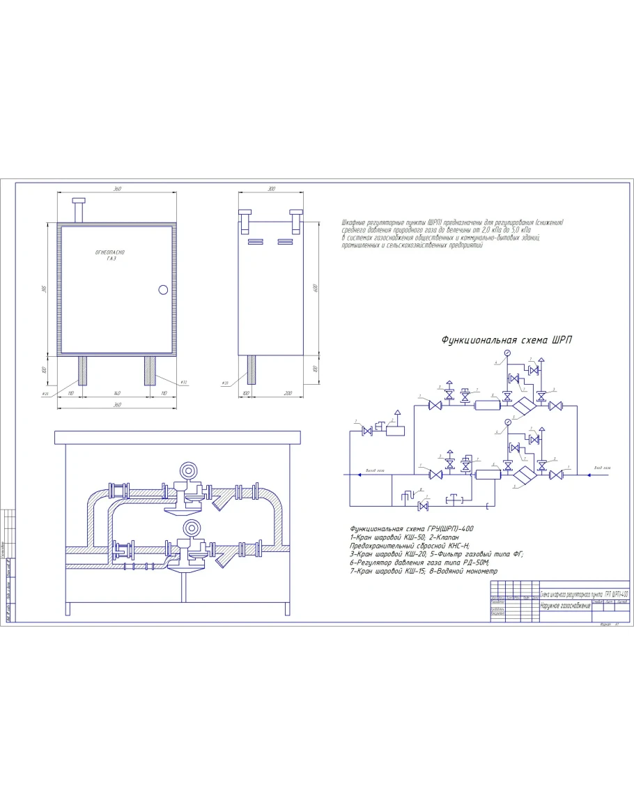 Схема шкафного регуляторного пункта ГРП (ШРП)-400. Наружнее газоснабжение.