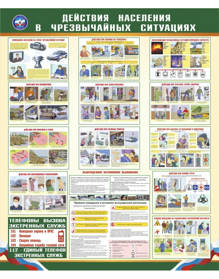 Плакат Действия населения в чрезвычайных ситуациях. Размер 1000х1200 в хорошем качестве для вывода на широкоформатных плоттерах. Для учебных заведений, организаций и уголков военной кафедры.