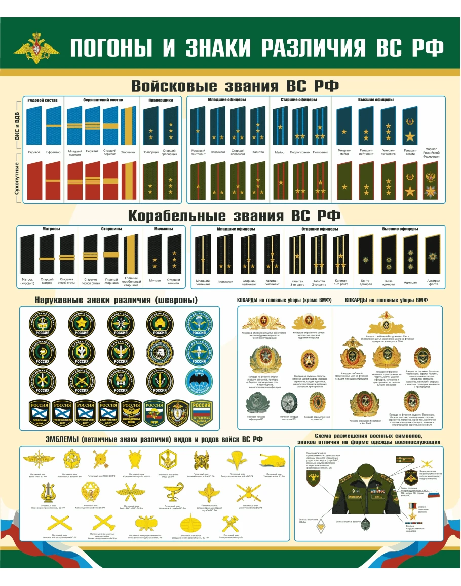 Плакат Погоны и знаки различия военнослужащих РФ. (с учетом последних изменений 2024) Размер 1000х1200 в хорошем качестве для вывода на широкоформатных плоттерах. Для учебных заведений и уголков военной кафедры.