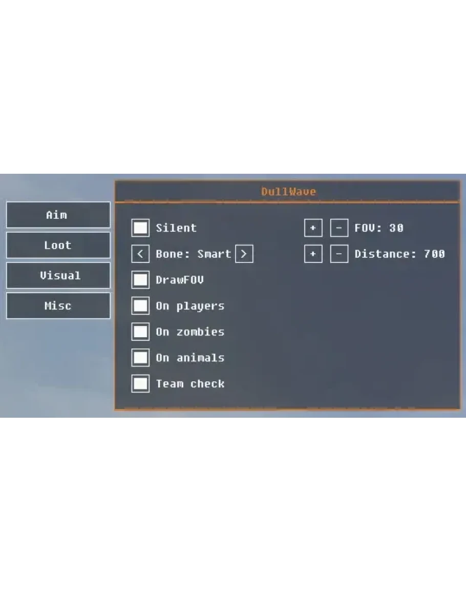 Вашему вниманию представлен надёжный многофункциональный приватный чит DullWave для игры DayZ. К нам на сайт он попал по причине множество положительных отзывов со стороны пользователей, которые регулярно продлевают свои ключи активации. Программу регулярно обновляют и поддерживают в актуальном состоянии. Низкий шанс блокировки.
