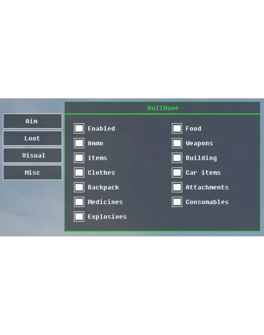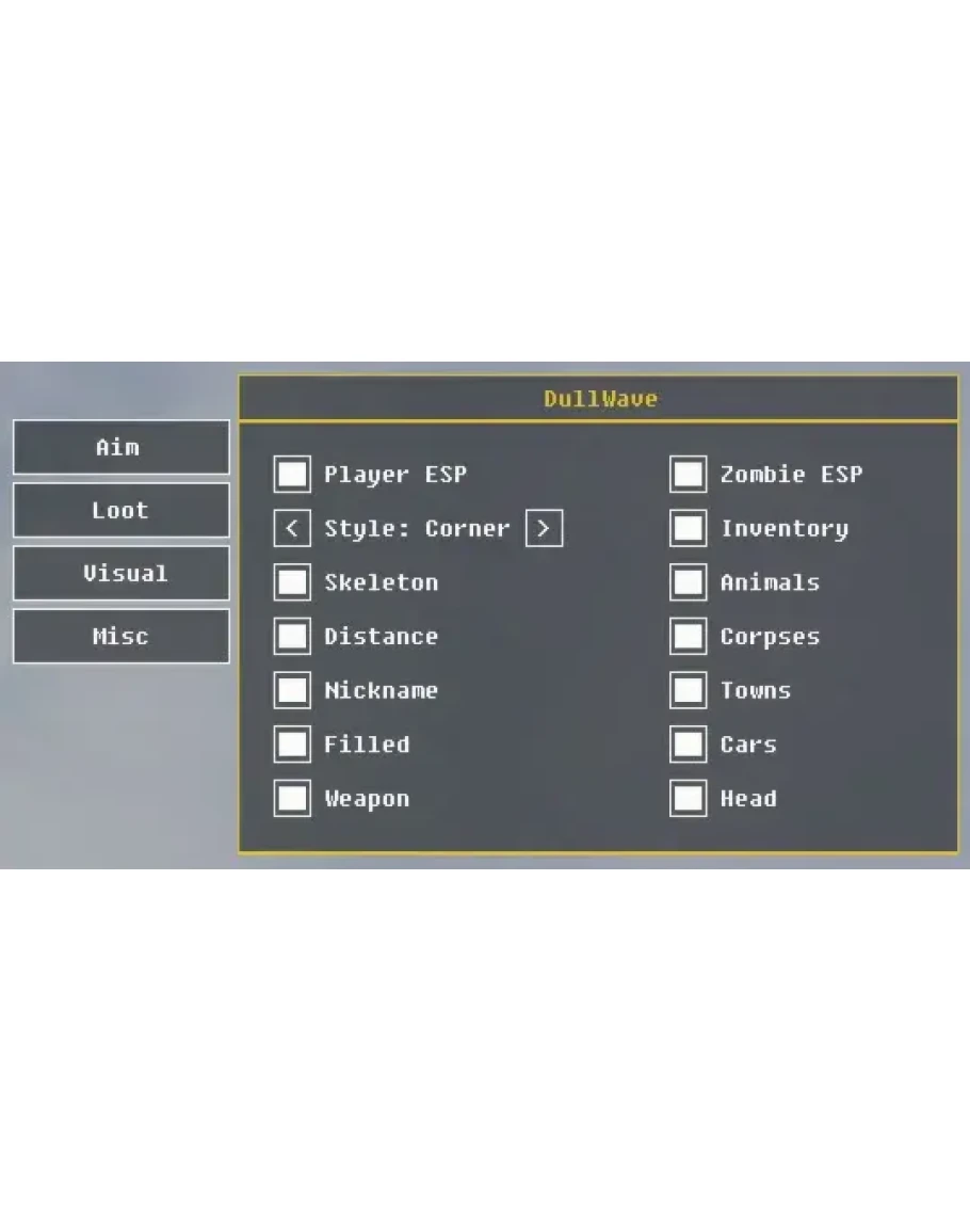 Вашему вниманию представлен надёжный многофункциональный приватный чит DullWave для игры DayZ. К нам на сайт он попал по причине множество положительных отзывов со стороны пользователей, которые регулярно продлевают свои ключи активации. Программу регулярно обновляют и поддерживают в актуальном состоянии. Низкий шанс блокировки.