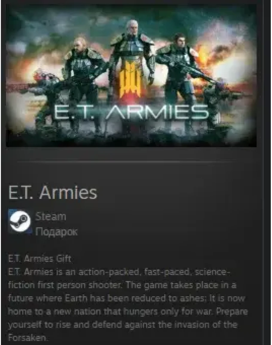 Э.Т. Armies — это динамичный научно-фантастический шутер от первого лица. Действие игры происходит в будущем, где Земля превратилась в пепел; Теперь здесь проживает новая нация, жаждущая только войны. Приготовьтесь подняться и защититься от вторжения Отрекшихся.