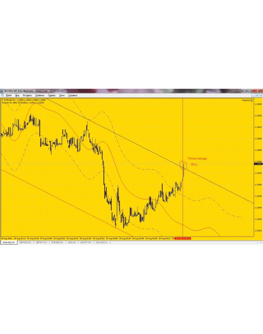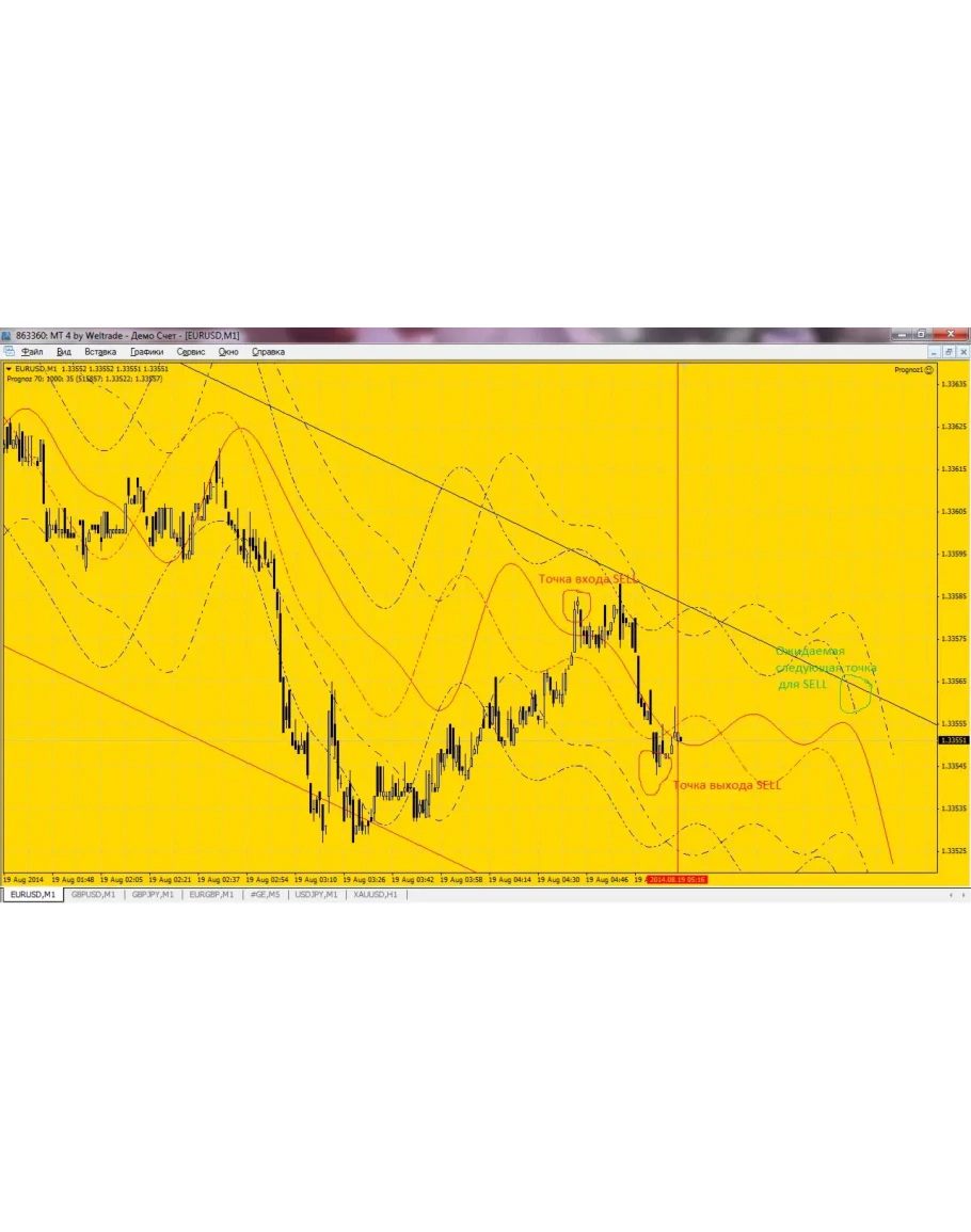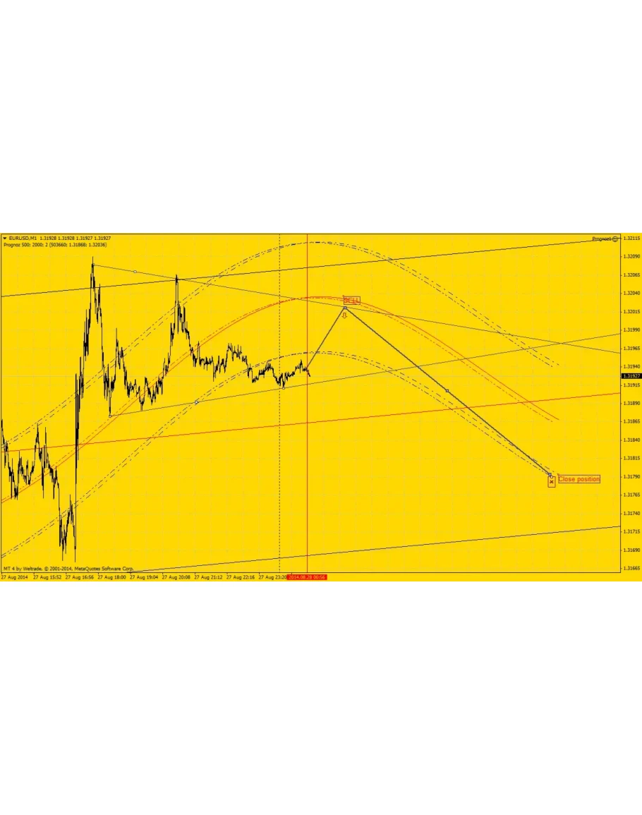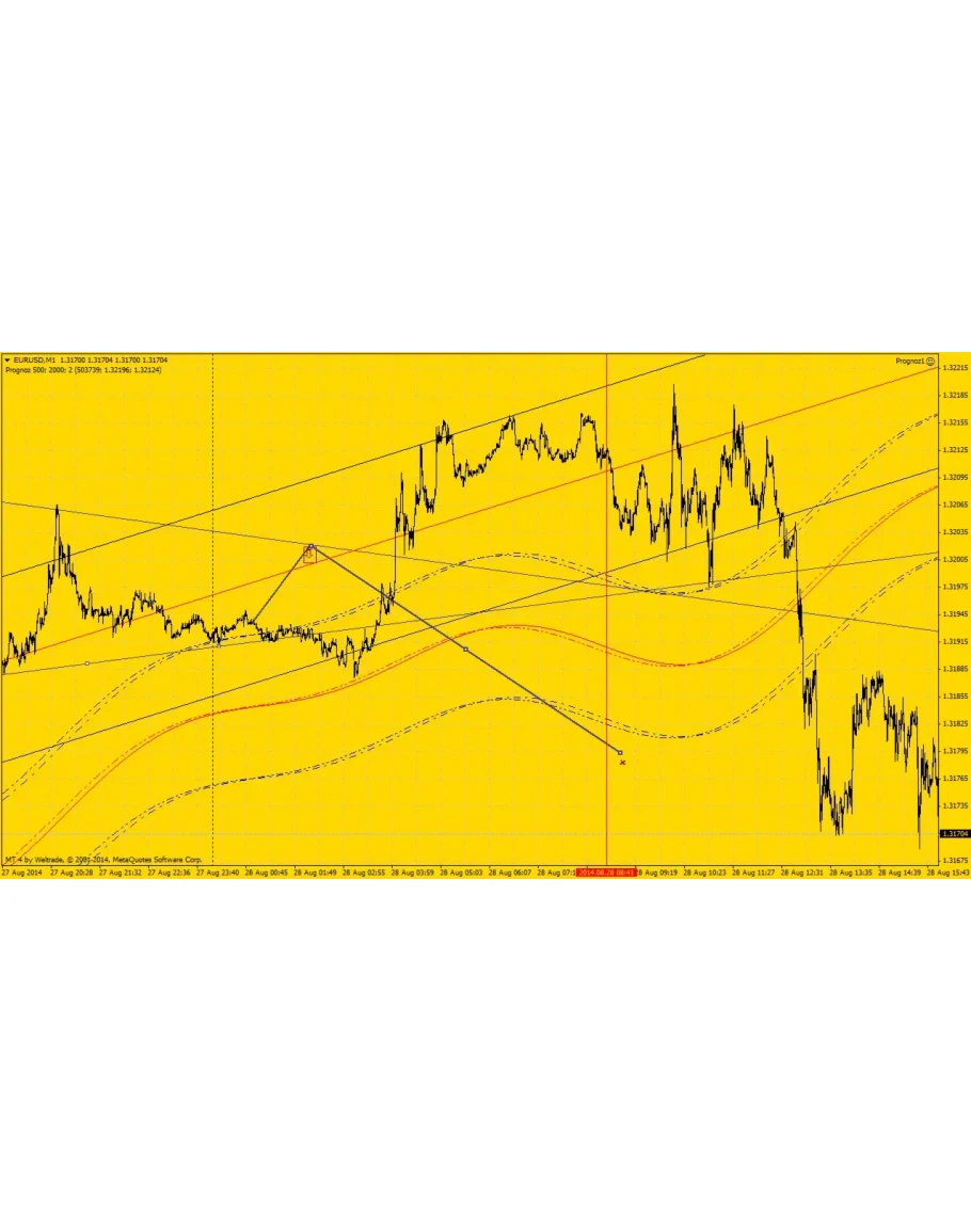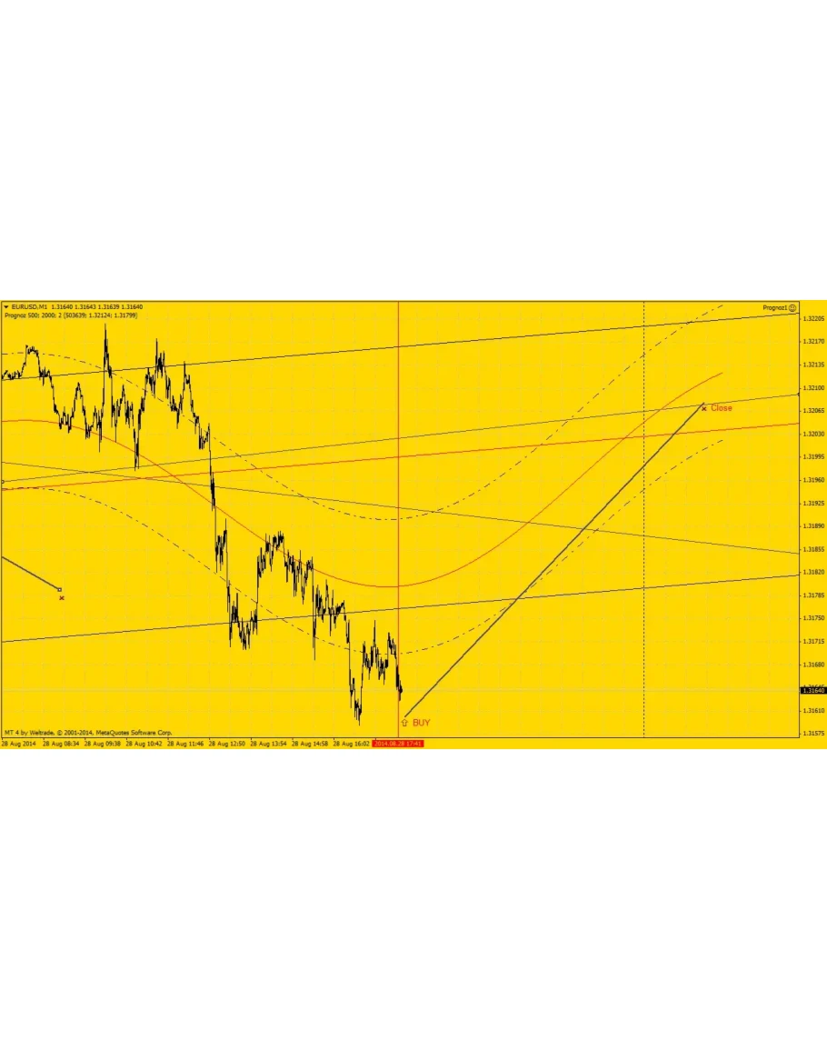 Далее на основании рассчитанного многочлена строится линия расчетного движения валютной пары в истории, которая продолжается на прогнозное количество свечей, заданное параметром Forecast. Также строится канал среднего отклонения фактических закрытий свечей от расчетной линии.