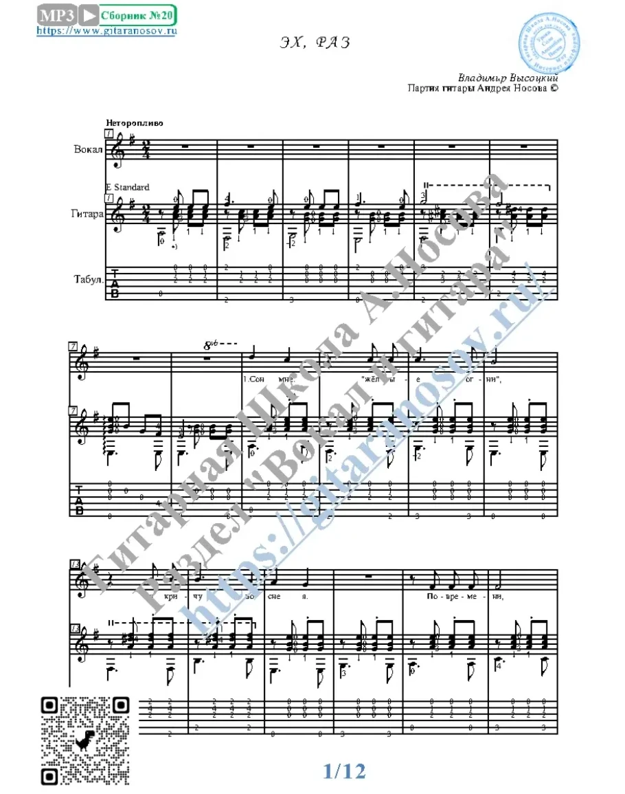 Товар состоит из двух частей (в одном PDF): 1 – Вокальная партия + гитарная партия с табулатурой; 2 – Вокальная партия + гитарная партия без табулатуры. Прилагается ссылка на прослушивание / скачивание mp3.