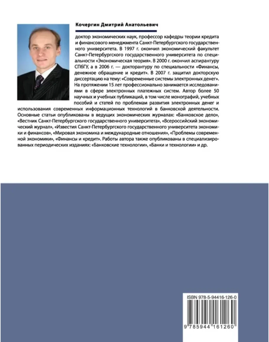 Автор: Кочергин Дмитрий Анатольевич — доктор экономических наук, профессор кафедры теории кредита и финансового менеджмента Санкт-Петербургского государственного университета. На протяжении 15 лет профессионально занимается исследованиями в сфере электронных платежных систем. Автор более 50 научных и учебных публикаций, в том числе монографий, учебных пособий и статей по проблемам развития электронных денег и использования современных информационных технологий в банковской деятельности.