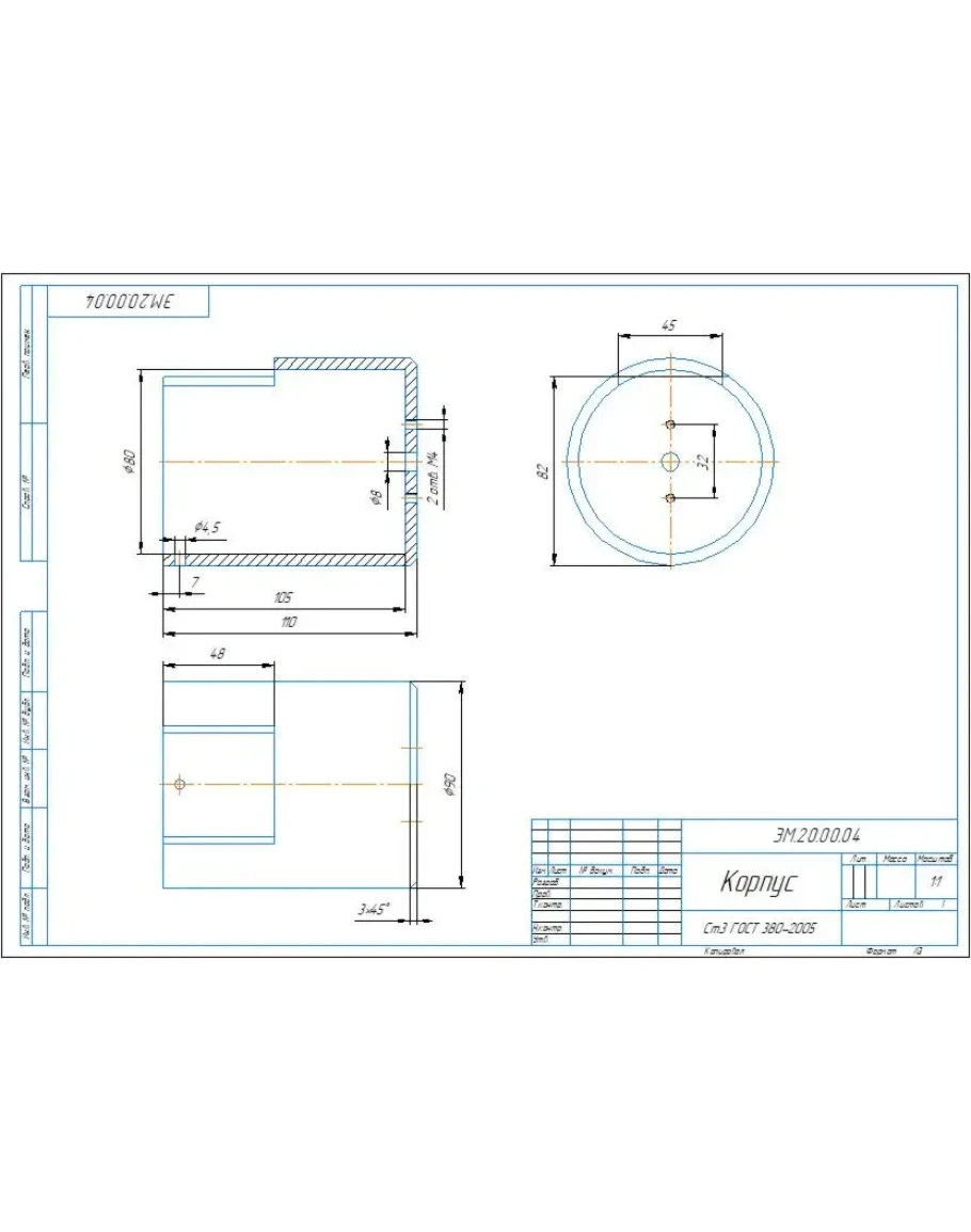 Рабочий чертеж детали корпус ЭМ.20.00.04 в программе Компас 3D