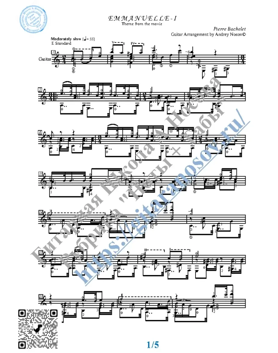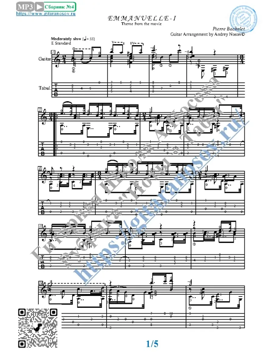 Кликните "Подробнее" для получения дополнительной информацииВашему вниманию предлагается композиция из фильма "Эммануэль-I (P.Bachelet)" из одноимённого фильма, предназначенная для исполнения на 6-ти струнной гитаре СОЛО. Запись выполнена нотами, сопровождена подробнейшей аппликатурой и продублирована табулатурой. И ещё…