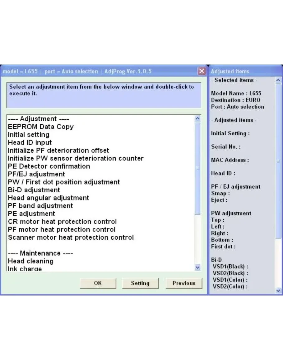 Adjustment Program - это сервисная программа для указанных моделей принтеров, программа позволяет сбросить счетчик памперса (отрботка, абсорбер)и других функций