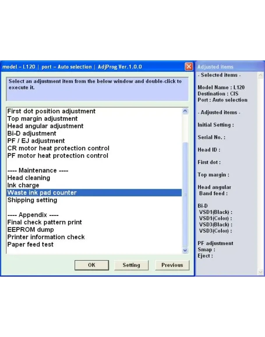 Adjustment program Epson L120 — это сервисная программа для указанной модели принтера, программа позволяет сбросить счетчик памперса (отрботка, абсорбер), прописывать ID печатающей головки, делать инициализацию принтера и другие функции.