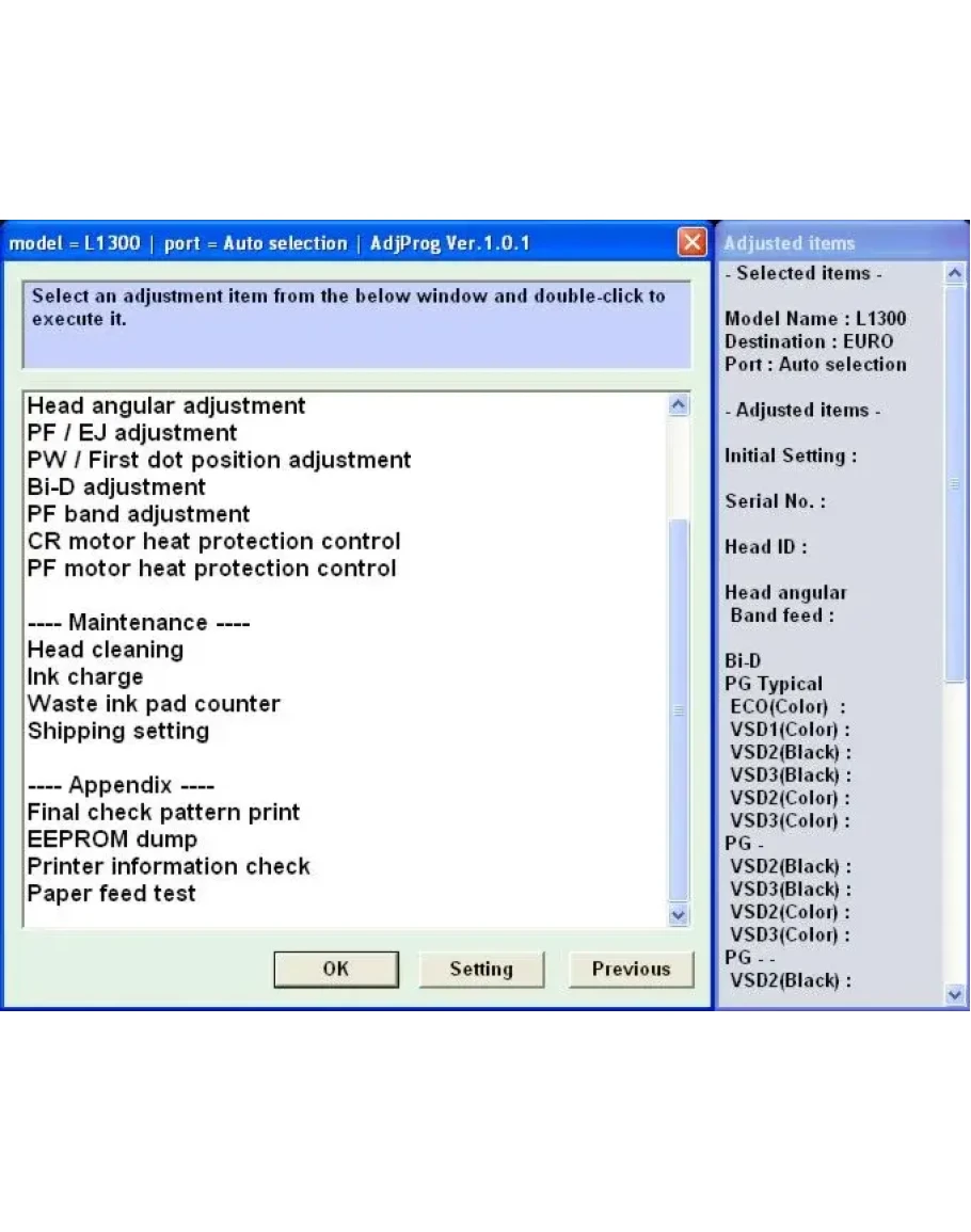 Epson L1300 (EURO, CIS) Ver.1.0.1 Service Adjustment Program — это оригинальная сервисная программа для указанной модели принтера, программа позволяет сбросить счетчик памперса (абсорбер), прописывать ID печатающей головки, делать инициализацию принтера и другие функции.