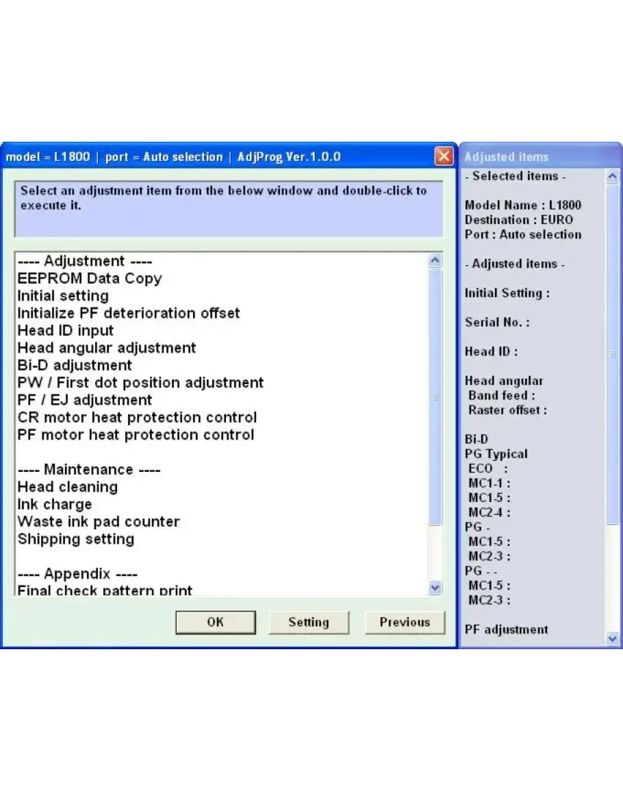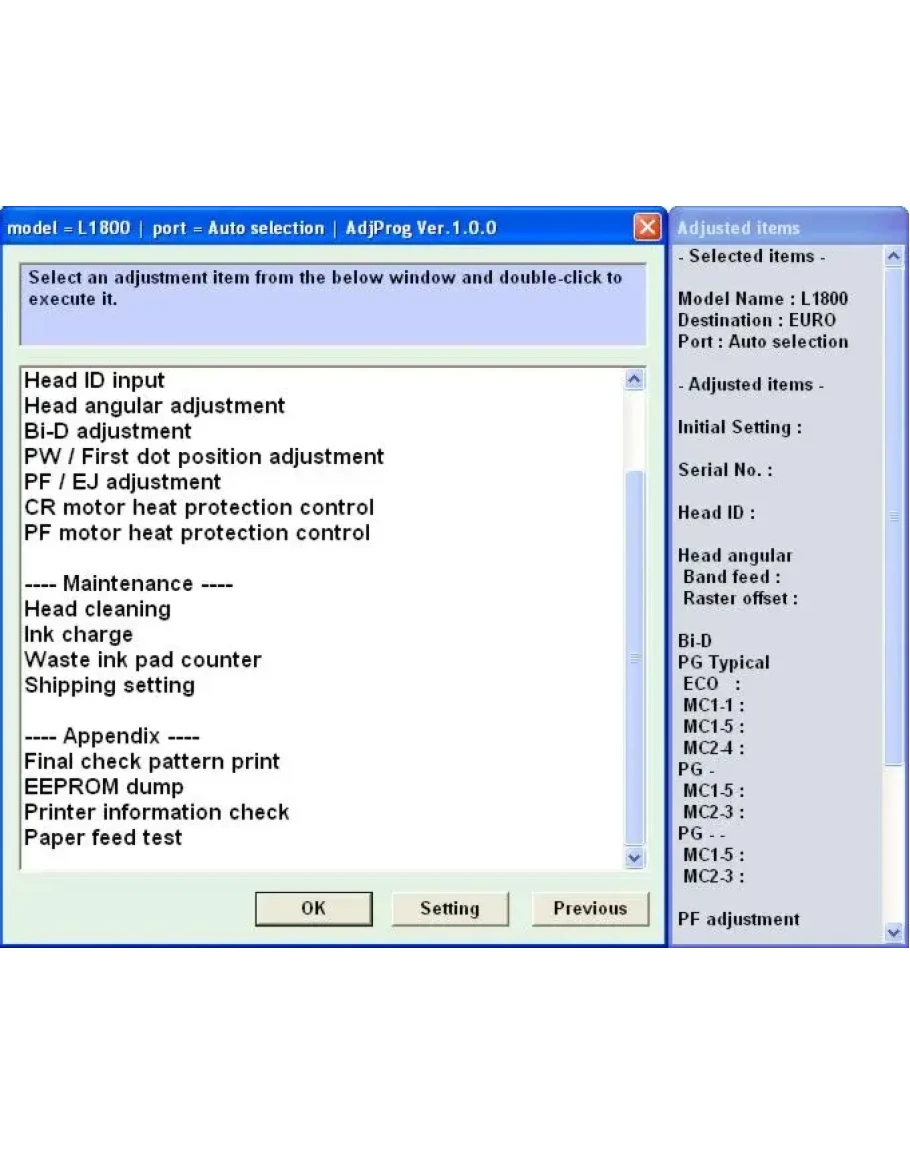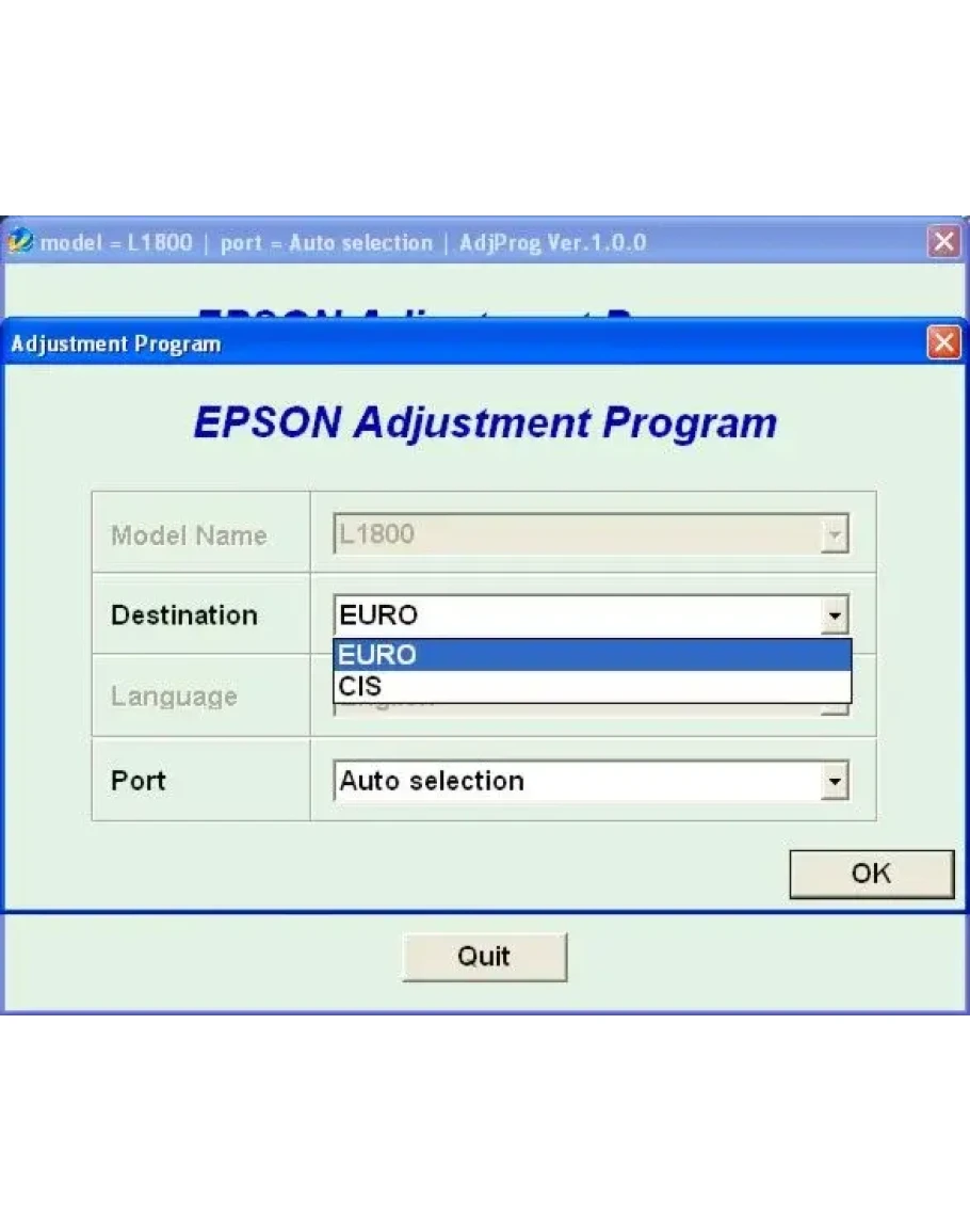 Epson L1800 Adjustment Program - это сервисная программа для указанных моделей принтеров, программа позволяет сбросить счетчик памперса (отрботка, абсорбер)и других функций
