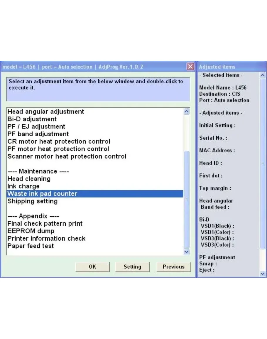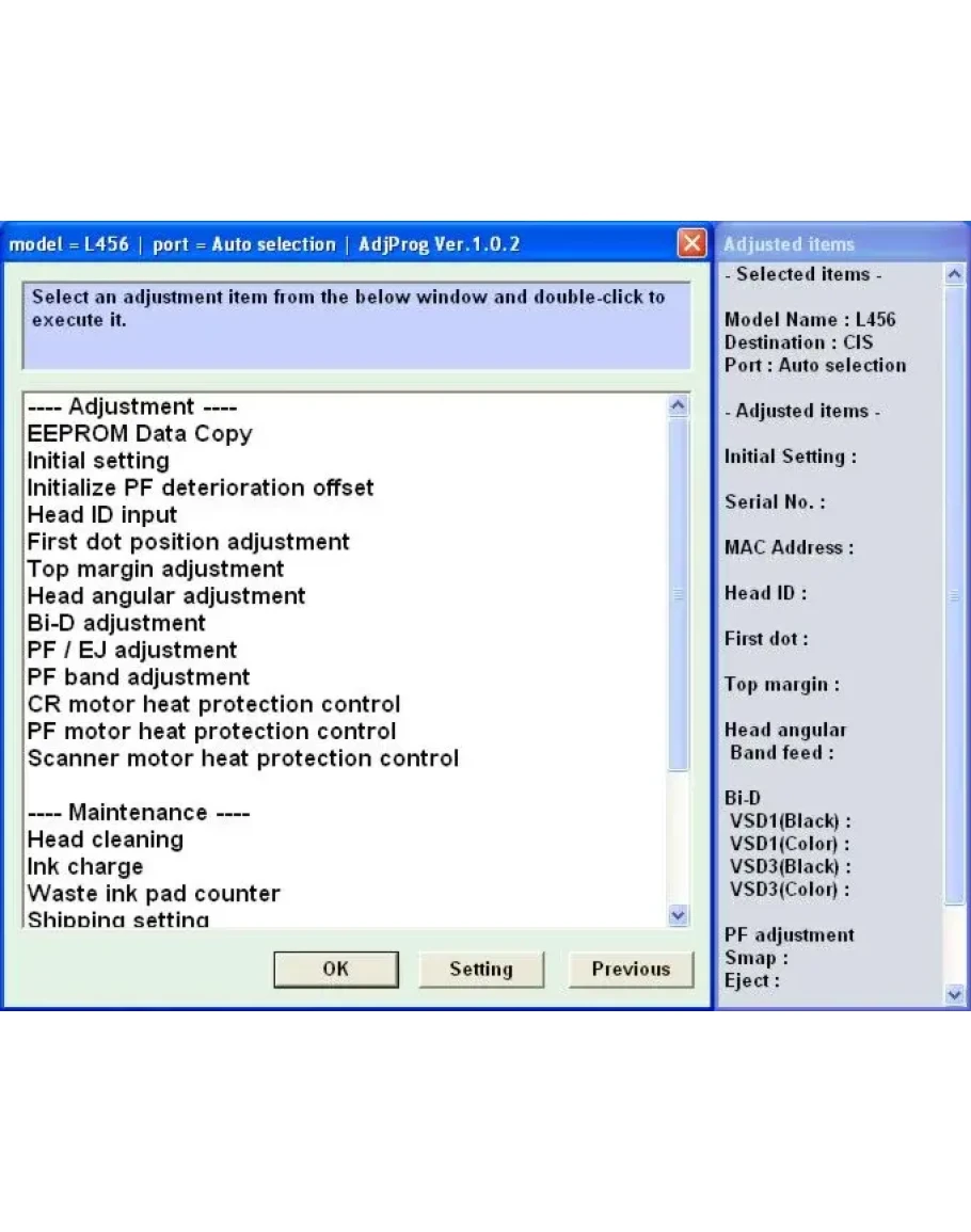 Adjustment program Epson L455, L456 (EURO, CIS) Ver.1.0.2 - это сервисная программа для указанных моделей принтеров, программа позволяет сбросить счетчик памперса (отрботка, абсорбер), прописывать ID печатающей головки, делать инициализацию принтера и другие функции.