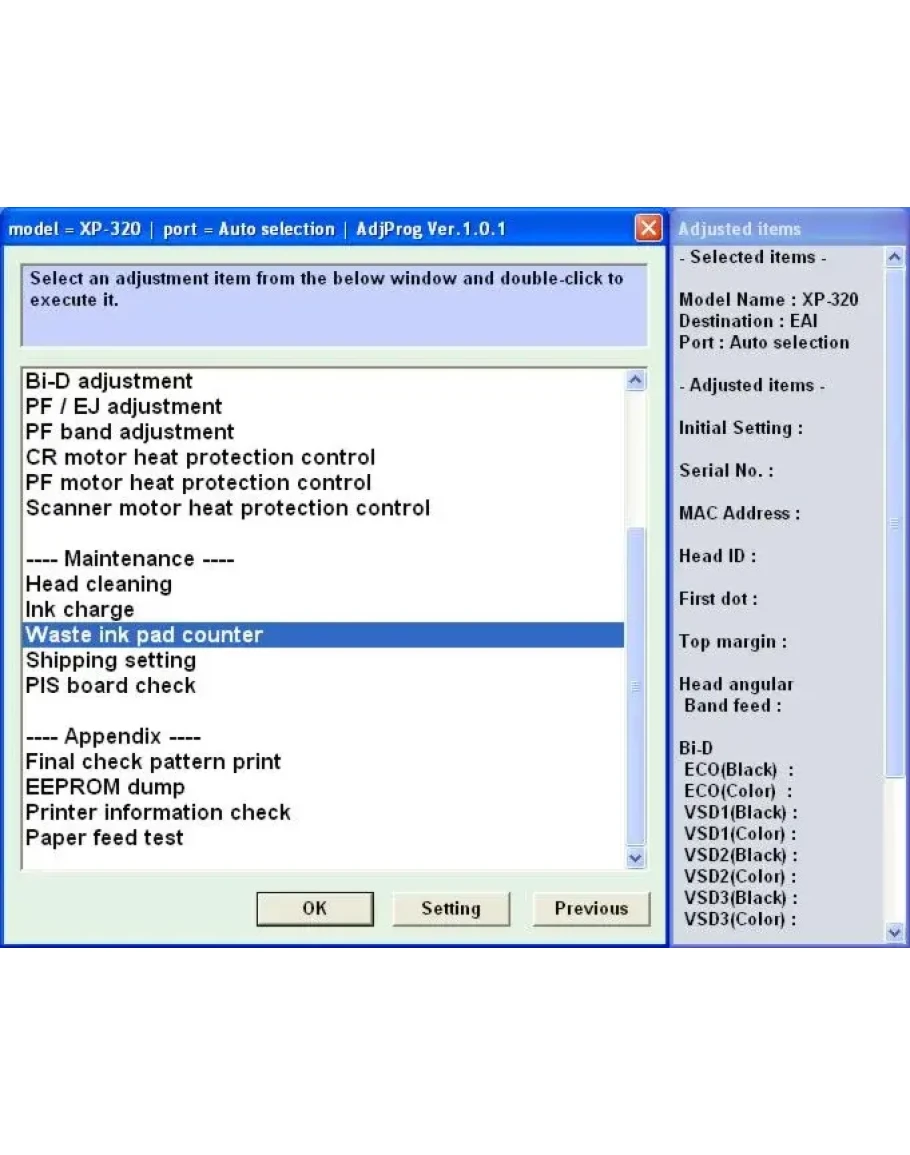Epson XP-320, XP-420, XP-424 (EAI) Ver.1.0.1 Service Adjustment Program — это сервисная программа для указанных моделей принтеров, программа позволяет сбросить счетчик памперса (отрботка, абсорбер), прописывать ID печатающей головки, делать инициализацию принтера и другие функции.