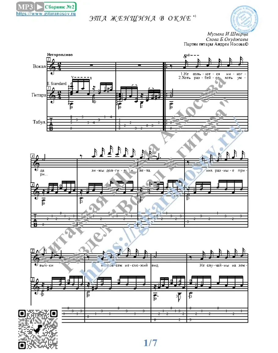 Товар состоит из двух частей (в одном PDF): 1 – Вокальная партия + гитарная партия с табулатурой; 2 – Вокальная партия + гитарная партия без табулатуры. Прилагается ссылка на прослушивание / скачивание mp3.