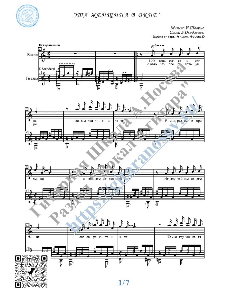 Кликните "Подробнее" для получения дополнительной информацииВашему вниманию предлагается композиция "Эта женщина в окне (муз.И.Шварца, сл.Б.Окуджавы)", предназначенная для вокала в сопровождении 6-ти струнной гитары. Запись выполнена нотами и включает в себя партию вокала с подтекстовкой, партию гитары с подробнейшей аппликатурой и текст песни (НА РУССКОМ).