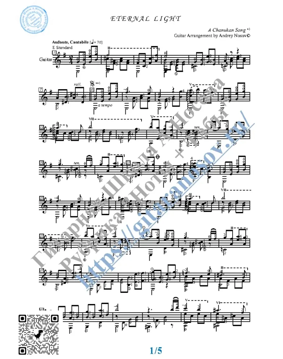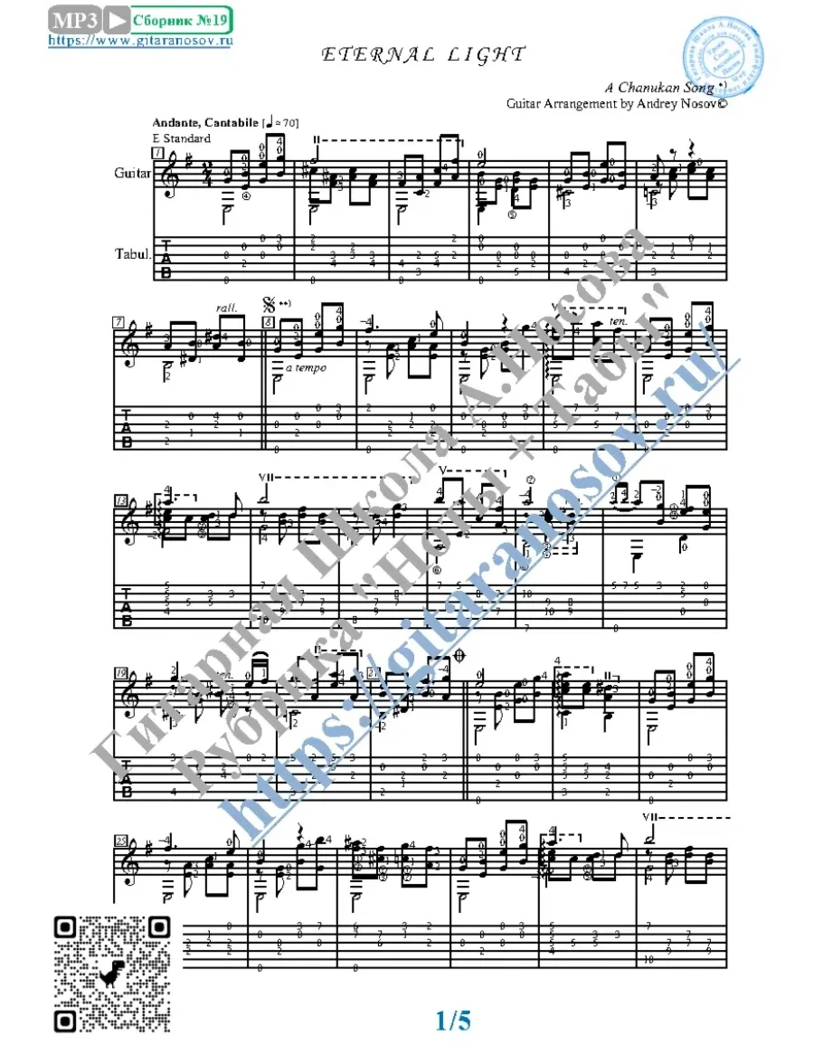 Кликните "Подробнее" для получения дополнительной информацииВашему вниманию предлагается композиция "Вечный свет (A Chanukan Song)", предназначенная для исполнения на 6-ти струнной гитаре СОЛО. Запись выполнена нотами, сопровождена подробнейшей аппликатурой и продублирована табулатурой. И ещё…