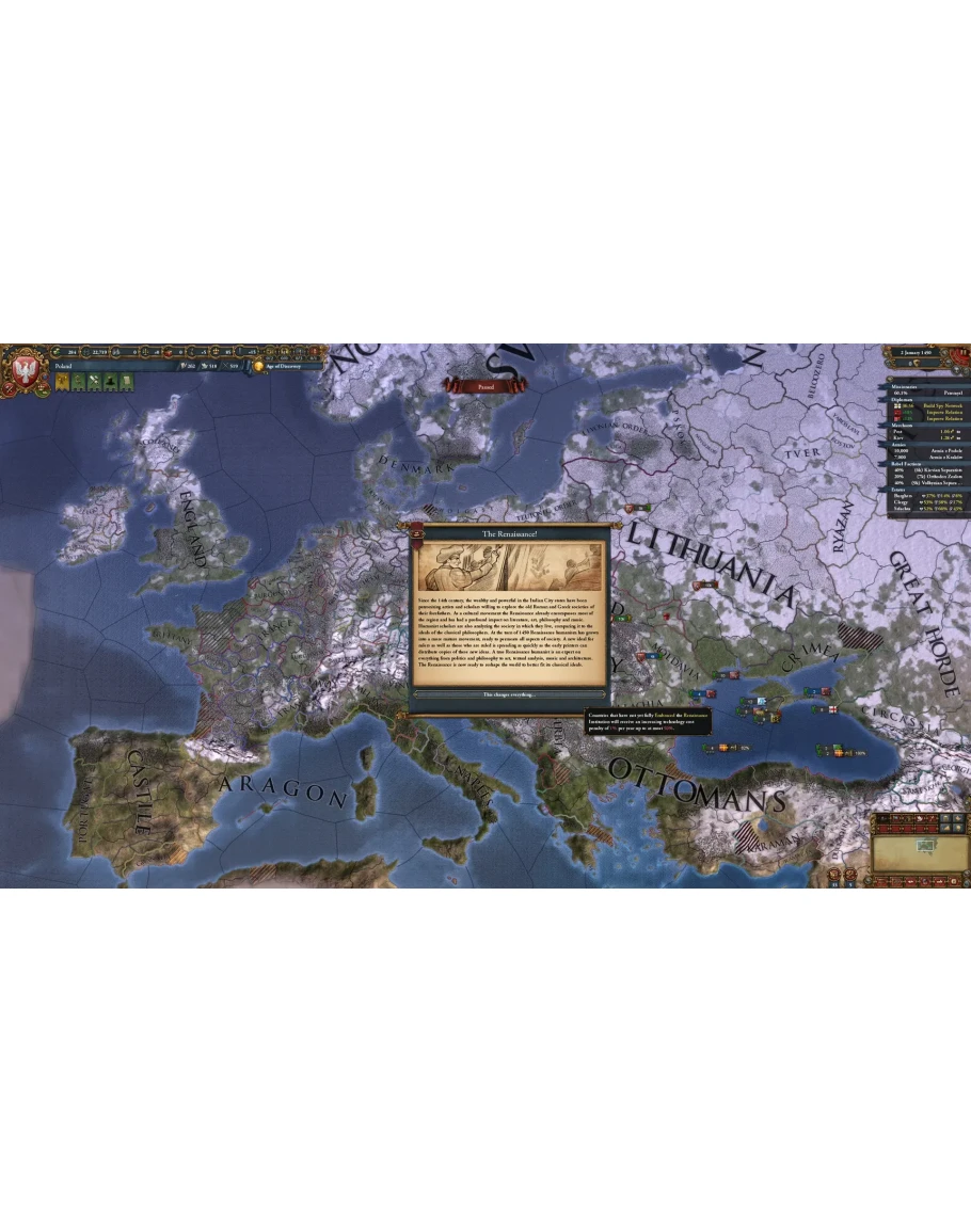 Четвертая часть удостоенной множества наград серии игр Europa Universalis, разработанная Paradox Tinto, предлагает возглавить любую нацию мира и управлять ею на протяжении четырех наполненных событиями веков, с позднего Средневековья и заканчивая Наполеоновской эпохой. Правьте своими землями и управляйте миром с полной свободой действий, проработанным игровым процессом и исторической точностью. Да прославится ваша империя в веках!