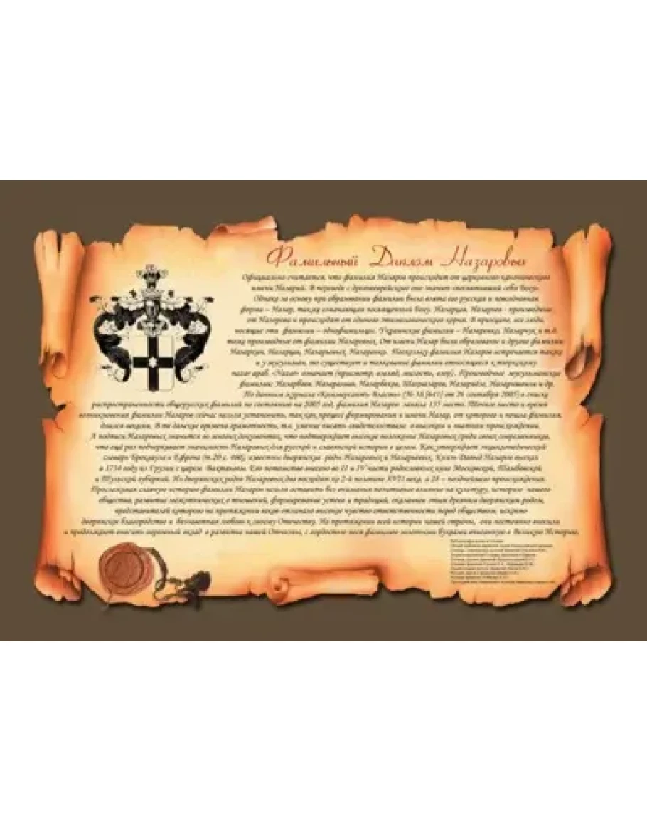 Фамильный диплом Назаровых – это оригинальный, необычный способ сделать приятный сюрприз родным и близким. Фамильный диплом Назаровых содержит анализ, расшифровку значения фамилии, толкование фамилии и много другой интересной информации.