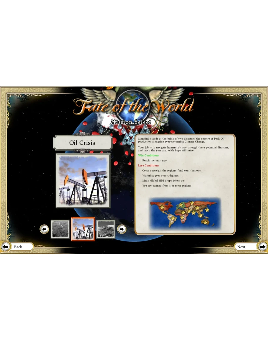 Fate of the World — глобальная стратегическая игра, в которой будущее зависит от ваших действий. В игре присутствует несколько драматичных сценариев, основанных на известных достижениях науки и затрагивающих целых два будущих века.