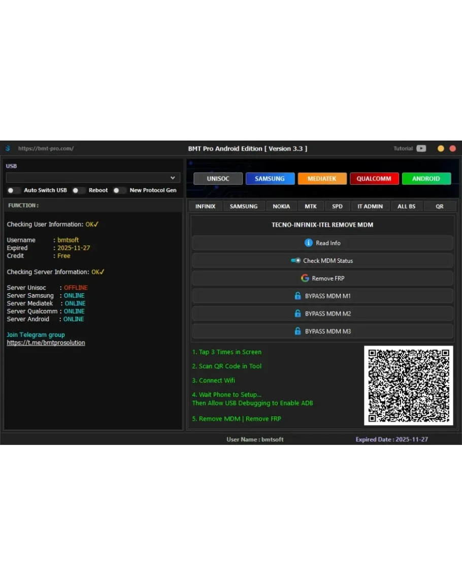 BMT Pro Tool — это профессиональное программное обеспечение, предназначенное для работы с мобильными устройствами, в основном смартфонами. Программа предоставляет широкий набор функций для обслуживания, ремонта и настройки телефонов, включая разблокировку, прошивку, восстановление IMEI, удаление FRP (Google-аккаунта), сброс паролей и другие операции. BMT Pro Tool поддерживает множество моделей устройств на базе Android, а также iOS.