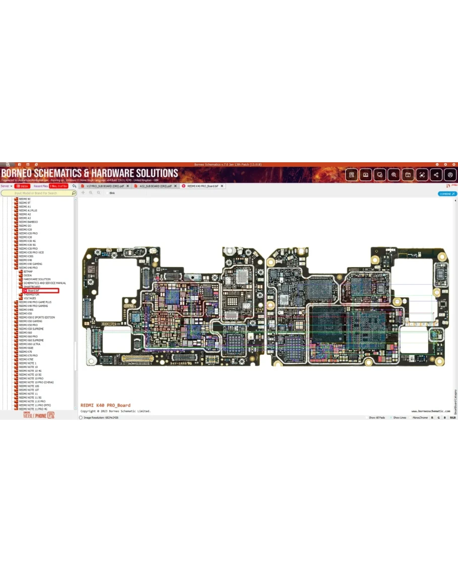 Borneo Schematics — это профессиональное программное обеспечение, предназначенное для специалистов по ремонту мобильных телефонов и другой портативной электроники. Программа предоставляет доступ к обширной базе данных схем (schematics), блок-диаграмм, измерительных точек (test points), а также информации о расположении компонентов на плате (PCB layout) для тысяч моделей смартфонов, включая устройства от таких брендов, как Samsung, Xiaomi, Oppo, Vivo, Huawei и многих других.