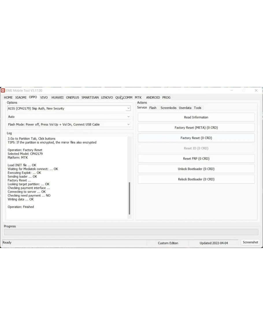 EME Mobile Tool — представляет собой мощный инструмент для работы с мобильными устройствами, предлагая широкий спектр функций для управления, ремонта и разблокировки. Поддерживает модули для Xiaomi, Oppo, Vivo, Samsung, OnePlus и Smartisan, обеспечивая такие операции, как чтение/стирание/запись разделов, сброс FRP, удаление экранных блокировок без потери данных, управление загрузчиком, чтение пользовательских данных (контакты, SMS, медиафайлы) и многое другое. Программа оснащена файловым менеджером разделов, поддерживает работу с EXT4, а также предоставляет возможность резервного копирования и восстановления данных. Удобный интерфейс и поддержка множества моделей делают ее незаменимым инструментом для профессионалов.