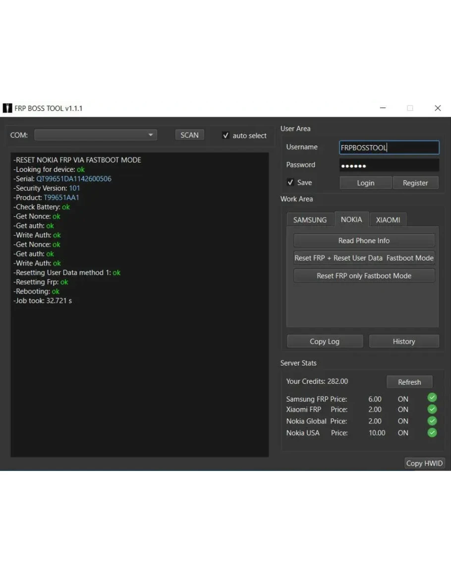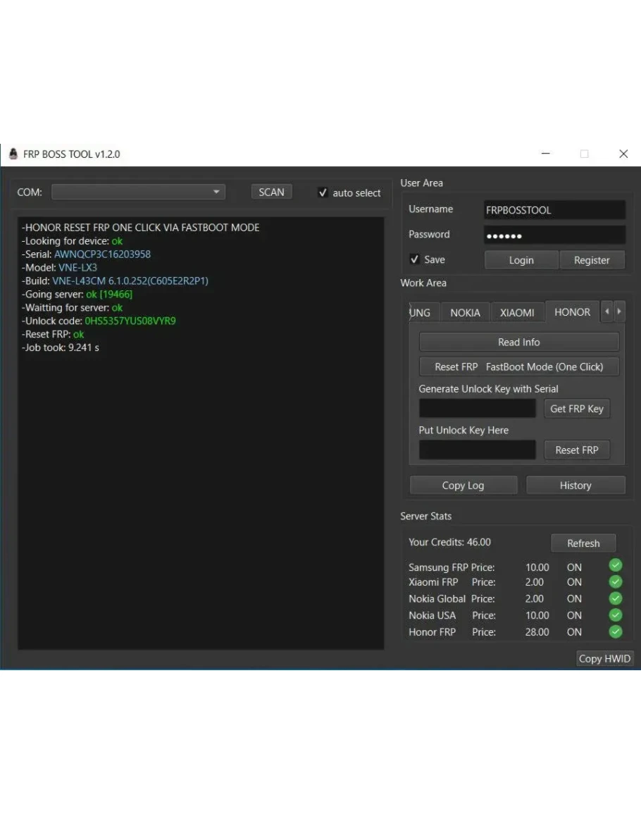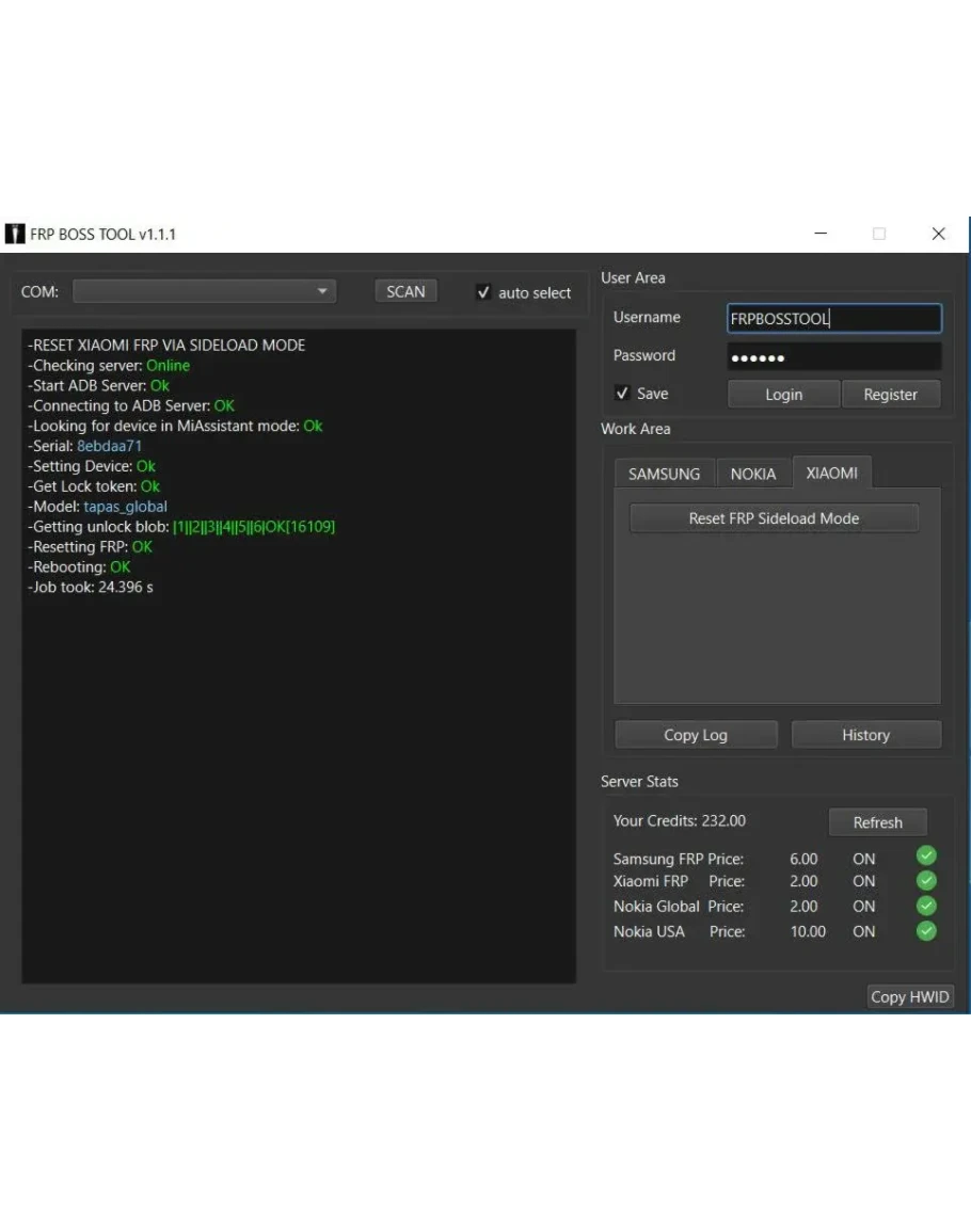 FRP Server работает стабильно и круглосуточно 24/7. Поддерживается удаленное обслуживание с использованием инструментов для совместного доступа USB. Инструмент предлагает лучшие цены на кредиты для разблокировки FRP — это дешево, удобно и эффективно.