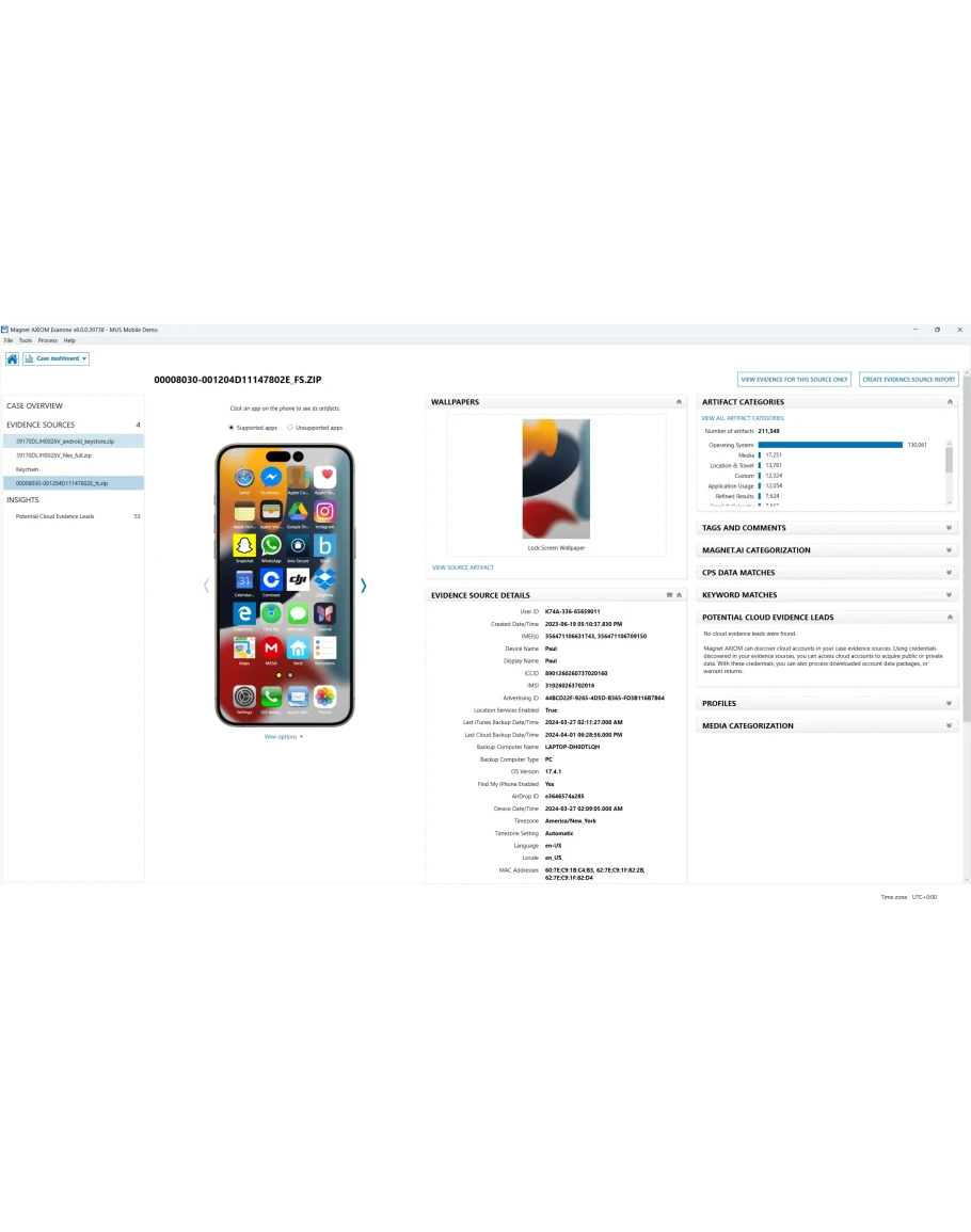 Magnet Axiom — это комплексное решение для цифровой криминалистики и расследований инцидентов (DFIR), предназначенное для сбора, анализа и представления цифровых доказательств с различных источников. Платформа объединяет данные из мобильных устройств (iOS/Android), компьютеров, облачных сервисов (Google, Meta, WhatsApp и др.) и даже автомобильных систем в едином кейсе.