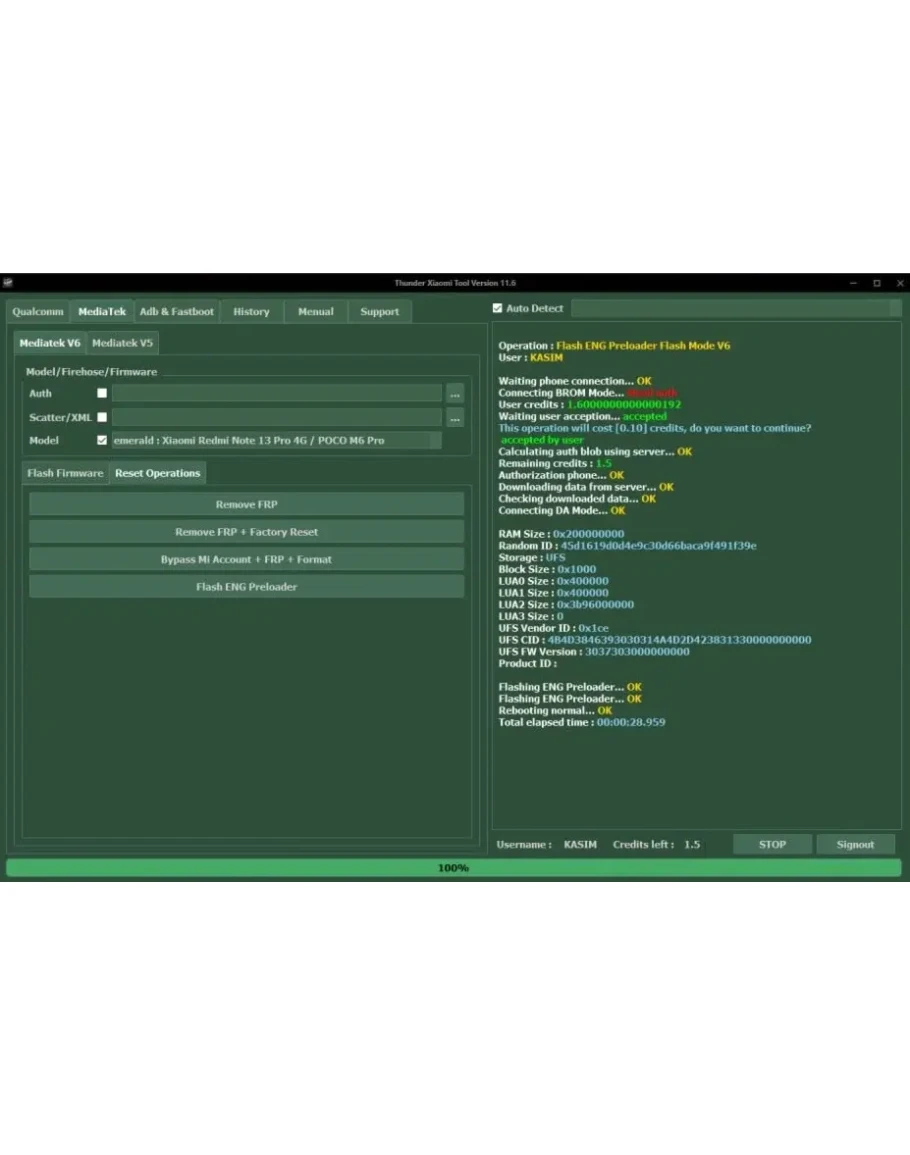 THUNDER XIAOMI TOOL – это профессиональный инструмент для обслуживания и ремонта устройств Xiaomi, предлагающий широкий спектр функций для работы с устройствами на базе Qualcomm и Mediatek. Программа обеспечивает быстрое и надежное выполнение операций, таких как разблокировка загрузчика, сброс FRP, прошивка, резервное копирование EFS и NVRAM, а также переход в режим EDL. Все услуги доступны по доступной цене, с гарантией возврата средств и качественной поддержкой для удовлетворения пользователей.